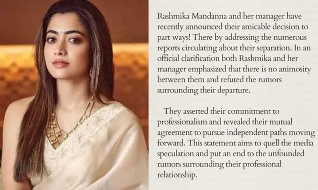 ರಶ್ಮಿಕಾ ಮಂದಣ್ಣ ಮತ್ತು ಅವರ ಮ್ಯಾನೇಜರ್ ಇಬ್ಬರೂ ದೀರ್ಘವಾದ ಹೇಳಿಕೆ ಬಿಡುಗಡೆ ಮಾಡಿ, ಇದೆಲ್ಲ ಸುಳ್ಳು ಸುದ್ದಿ ಯಾವುದೇ ಮೋಸ ಆಗಿಲ್ಲ ಎಂದಿದ್ದಾರೆ. 'ನಮ್ಮ ನಡುವೆ ಯಾವುದೇ ನಕಾರಾತ್ಮಕತೆ ಇಲ್ಲ. ನಾವು ಸೌಹಾರ್ದಯುತವಾಗಿಯೇ ಬೇರೆಯಾಗಲು ನಿರ್ಧರಿಸಿದ್ದೇವೆ. ಸದ್ಯ ಹರಿದಾಡುತ್ತಿರುವ ವದಂತಿಗಳಲ್ಲಿ ಯಾವುದೇ ಸತ್ಯವಿಲ್ಲ. ನಾವು ಸಂಪೂರ್ಣ ವೃತ್ತಿಪರರು ಮತ್ತು ಇನ್ನು ಮುಂದೆ ಸ್ವತಂತ್ರವಾಗಿ ಕೆಲಸ ಮಾಡಲು ನಿರ್ಧರಿಸಿದ್ದೇವೆ' ಎಂದು ರಶ್ಮಿಕಾ ಮತ್ತು ಅವರ ಮ್ಯಾನೇಜರ್ ಗುರುವಾರ ತಡವಾಗಿ ಹೇಳಿಕೆ ಬಿಡುಗಡೆ ಮಾಡಿದ್ದಾರೆ.