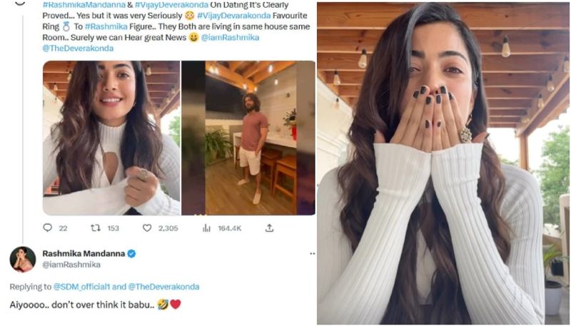 ಅಭಿಮಾನಿಯೊಬ್ಬರು ರಶ್ಮಿಕಾ ಮತ್ತು ವಿಜಯ್ ದೇವರಕೊಂಡ ಪ್ರೀತಿ ಸಾಬೀತಾಗಿದೆ. ಇಬ್ಬರೂ ಒಟ್ಟಿಗೆ ಒಂದೇ ಮನೆಯಲ್ಲಿ ವಾಸಿಸುತ್ತಿದ್ದಾರೆ. ವಿಜಯ್ ದೇವರಕೊಂಡ, ರಶ್ಮಿಕಾಗೆ ಉಂಗುರ ಗಿಫ್ಟ್ ಮಾಡಿದ್ದಾರೆ. ಸದ್ಯದಲ್ಲಿ ಬಿಗ್ ಸುದ್ದಿ ನೀಡುತ್ತಾರೆ ಎಂದು ಕಾಮೆಂಟ್ ಮಾಡಿದ್ದಾರೆ. ಅಭಿಮಾನಿಯ ಕಾಮೆಂಟ್ಗೆ ರಶ್ಮಿಕಾ ಪ್ರತಿಕ್ರಿಯೆ ನೀಡಿದ್ದಾರೆ. 'ಅಯ್ಯೋ...ಈ ಬಗ್ಗೆ ಅತಿಯಾಗಿ ಚಿಂತಸ ಬೇಡ ಬಾಬು' ಎಂದು ಹೇಳಿ ಹಾರ್ಟ್ ಇಮೋಜಿ ಹಾಕಿದ್ದಾರೆ. ರಶ್ಮಿಕಾ ಅವರ ಈ ಪ್ರತಿಕ್ರಿಯೆ ಸಾಮಾಜಿಕ ಜಾಲತಾಣದಲ್ಲಿ ವೈರಲ್ ಆಗಿದೆ. ಈ ಮೂಲಕ ರಶ್ಮಿಕಾ ವಿಜಯ್ ದೋವರಕೊಂಡ ಜೊತೆಗಿನ ಡೇಟಿಂಗ್ ವದಂತಿಯನ್ನು ತಳ್ಳಿಹಾಕಿದ್ದಂತೆ ಇದೆ.