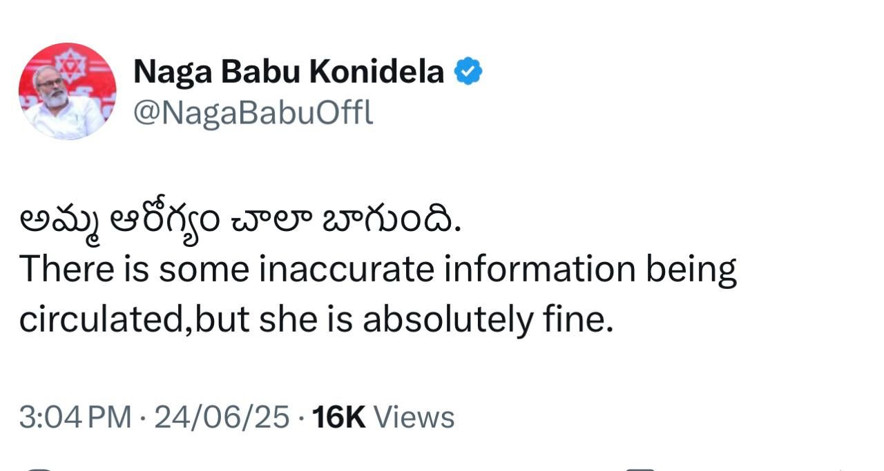 ಅಂಜನಾದೇವಿ ಅನಾರೋಗ್ಯದ ಸುದ್ದಿ ವೈರಲ್ ಆಗುತ್ತಿದ್ದಂತೆ ಮೆಗಾ ಅಭಿಮಾನಿಗಳು ಸಾಮಾಜಿಕ ಜಾಲತಾಣಗಳಲ್ಲಿ "ಅಂಜನಮ್ಮ ಬೇಗ ಗುಣಮುಖರಾಗಲಿ" ಎಂದು ಪೋಸ್ಟ್ಗಳನ್ನು ಹಂಚಿಕೊಳ್ಳಲು ಪ್ರಾರಂಭಿಸಿದರು. ಈ ವದಂತಿಗಳ ಬಗ್ಗೆ ಮೆಗಾ ಬ್ರದರ್ ನಾಗಬಾಬು ಸ್ಪಷ್ಟನೆ ನೀಡಿದ್ದಾರೆ. ಎಕ್ಸ್ (ಟ್ವಿಟರ್) ವೇದಿಕೆಯಲ್ಲಿ ಸ್ಪಂದಿಸಿದ ನಾಗಬಾಬು, ಅಂಜನಾ ದೇವಿ ಅವರ ಆರೋಗ್ಯದ ಬಗ್ಗೆ ಹಬ್ಬಿದ್ದ ವದಂತಿಗಳನ್ನು ತಳ್ಳಿಹಾಕಿದ್ದಾರೆ. ನಾಗಬಾಬು ಟ್ವೀಟ್ ಮಾಡಿ, "ಅಮ್ಮ ಆರೋಗ್ಯವಾಗಿದ್ದಾರೆ. ಕೆಲವರು ಹಬ್ಬಿಸಿರುವ ಸುಳ್ಳು ಸುದ್ದಿಯಿಂದ ಈ ವದಂತಿ ಹುಟ್ಟಿಕೊಂಡಿದೆ. ಅಮ್ಮ ಚೆನ್ನಾಗಿದ್ದಾರೆ" ಎಂದು ಸ್ಪಷ್ಟಪಡಿಸಿದ್ದಾರೆ.