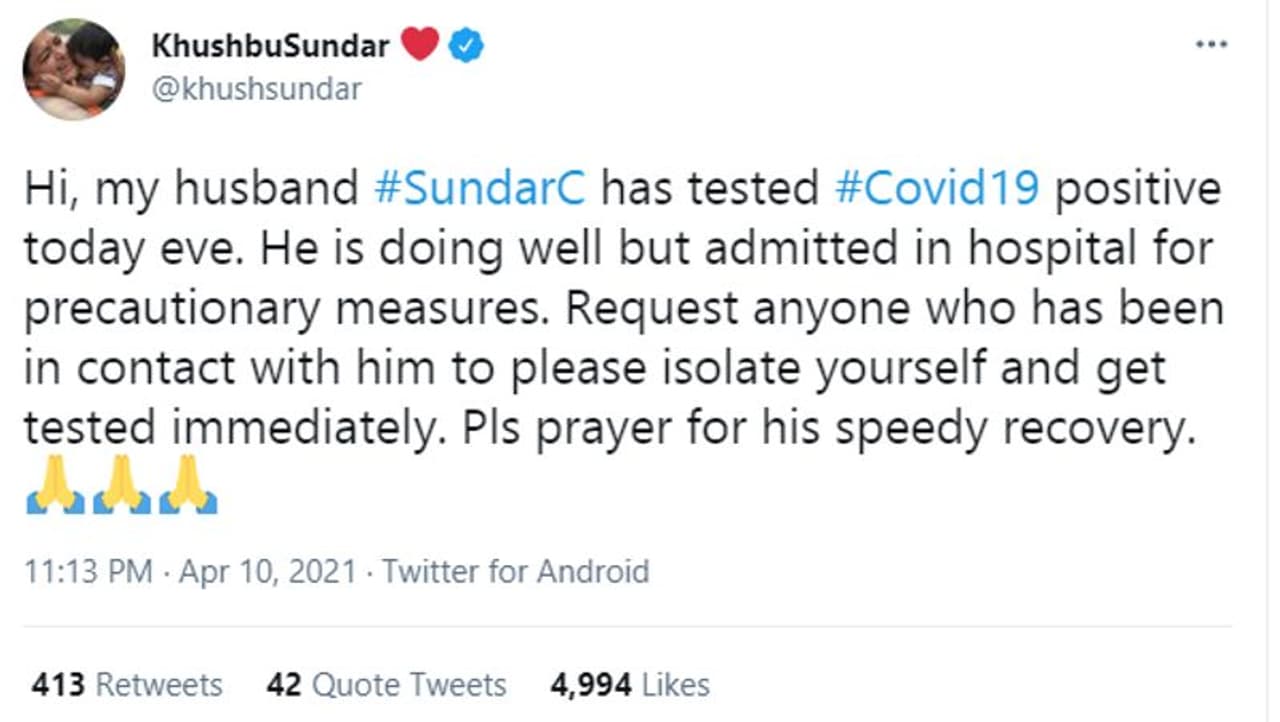 ಕ್ವಾರಂಟೈನ್ನಲ್ಲಿರುವ ಕಾರಣ ಕೆಲವು ದಿನಗಳ ಕಾಲ ವಿಡಿಯೋ ಕಾನ್ಫರೆನ್ಸ್ ಮೂಲಕ ಪಕ್ಷದ ಮುಖಂಡರು ಹಾಗೂ ಸಿನಿಮಾ ತಂಡದ ಜೊತೆ ಸಂಪರ್ಕದಲ್ಲಿರುತ್ತಾರೆ ಎಂಬ ಮಾಹಿತಿ ತಿಳಿದು ಬಂದಿದೆ. ಇನ್ನೂ ಖುಷ್ಬೂ ಪತಿ ನಿರ್ದೇಶಕ ಸುಂದರ್ಗೆ ಕೊರೋನಾ ಪಾಸಿಟಿವ್ ಎಂದು ತಿಳಿದು ಬಂದಿದೆ. 'ಸುಂದರ್ ಆರೋಗ್ಯವಾಗಿದ್ದಾರೆ. ವೈದ್ಯರು ನೀಡಿರುವ ಸಲಹೆಯಿಂದ ಆಸ್ಪತ್ರೆ ಸೇರಿದ್ದಾರೆ. ಕೆಲವು ದಿನಗಳಿಂದ ಅವರ ಸಂಪರ್ಕದಲ್ಲಿದ್ದವರು ದಯವಿಟ್ಟು ಪರೀಕ್ಷೆ ಮಾಡಿಸಿಕೊಳ್ಳಿ,' ಎಂದು ಟ್ಟೀಟ್ ಮಾಡುವ ಮೂಲಕ ನಟಿ ಖುಷ್ಬೂ ಮನವಿ ಮಾಡಿಕೊಂಡಿದ್ದಾರೆ.