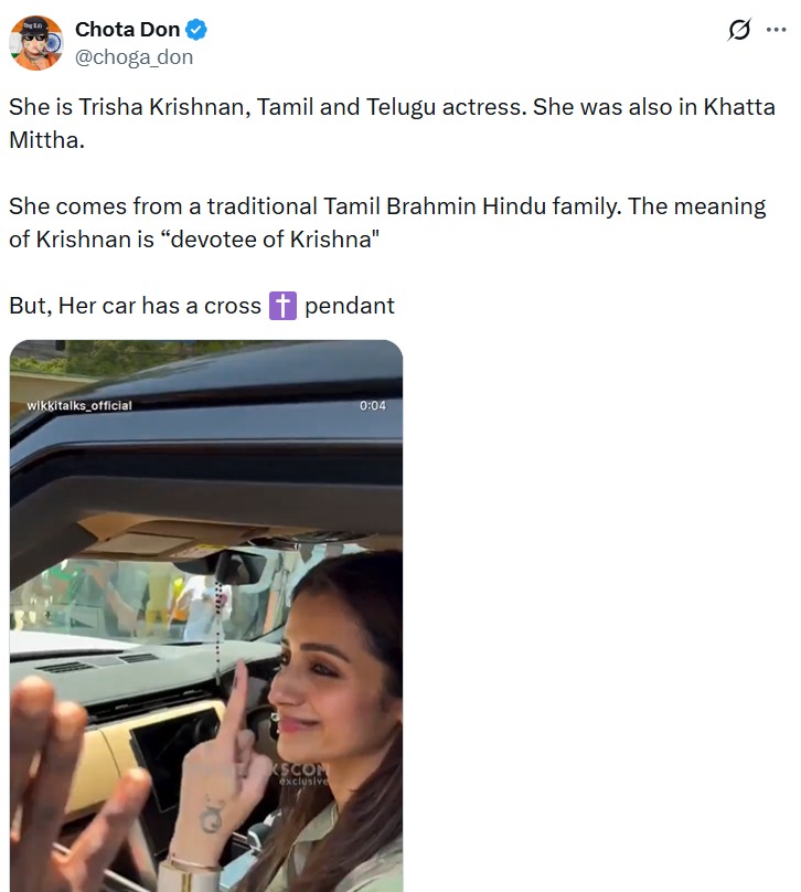 ಈ ಪೋಸ್ಟ್ನಲ್ಲಿ ತ್ರಿಶಾ ಅವರ ಕಾರಿನ ಒಳಭಾಗದ ವಿಡಿಯೋ ಹಂಚಿಕೊಳ್ಳಲಾಗಿದ್ದು, ಅದರಲ್ಲಿ ಎಲ್ಲರ ಗಮನ ಸೆಳೆದಿದ್ದು ಒಂದು 'ಕ್ರಾಸ್' (✝️) ಪೆಂಡೆಂಟ್! ಹೌದು, ಬ್ರಾಹ್ಮಣ ಕುಟುಂಬದ ನಟಿಯ ಕಾರಿನಲ್ಲಿ ಕ್ರೈಸ್ತ ಧರ್ಮದ ಸಂಕೇತವಾದ ಕ್ರಾಸ್ ಕಂಡ ತಕ್ಷಣ ನೆಟ್ಟಿಗರು ಅಚ್ಚರಿಯ ಶಾಕ್ಗೆ ಒಳಗಾಗಿದ್ದಾರೆ.
