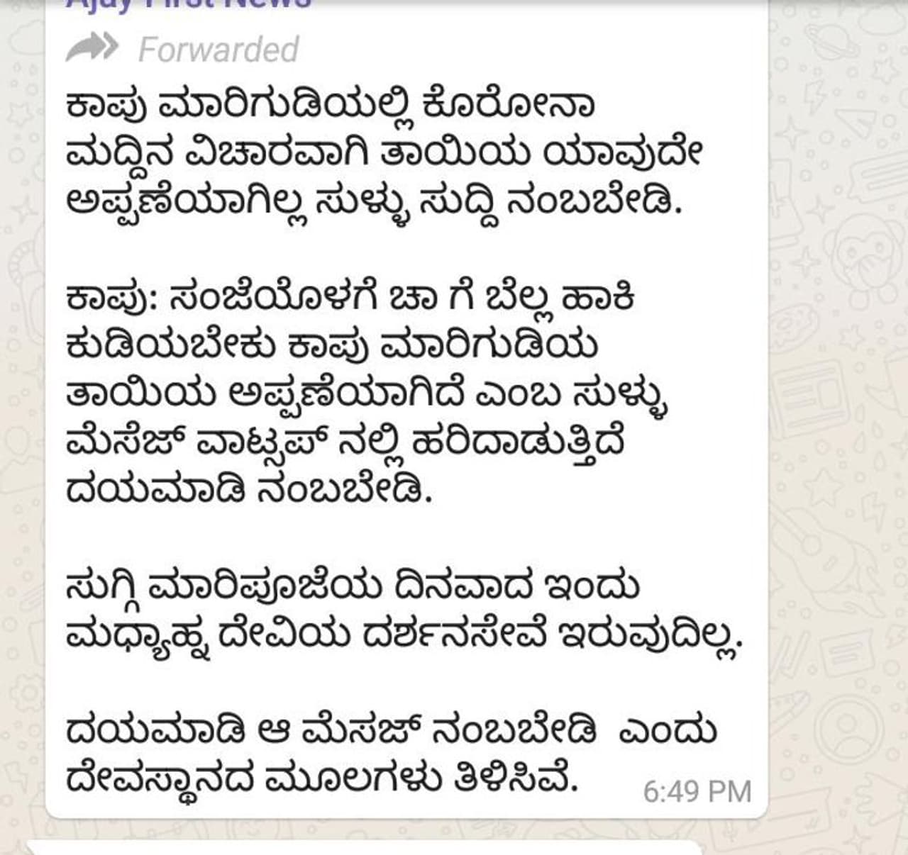 ಮಂಗಳೂರು(ಮಾ.25): ಕೊರೋನಾ ವೈರಸ್ ನಿವಾರಣೆಗಾಗಿ ಸಂಜೆಯೊಳಗೆ ಭಕ್ತರೆಲ್ಲರೂ ಚಹಾಕ್ಕೆ ಬೆಲ್ಲ ಮತ್ತು ಅರಿಶಿಣ ಹುಡಿ ಹಾಕಿ ಕುಡಿಯಬೇಕು, ಆಗ ನಾನು ಕೊರೋನಾ ವೈರಸ್ ಯಾರಿಗೂ ಹಾನಿಯಾಗದಂತೆ ತಡೆಯುತ್ತೇನೆ ಎಂದು ಕಾಪು ಮಾರಿಯಮ್ಮನ ಅಪ್ಪಣೆಯಾಗಿದೆ ಎಂಬ ಸುಳ್ಳು ಸುದ್ದಿ ಸಾಮಾಜಿಕ ಜಾಲತಾಣಗಳಲ್ಲಿ ವೈರಲ್ ಆಗಿದೆ.