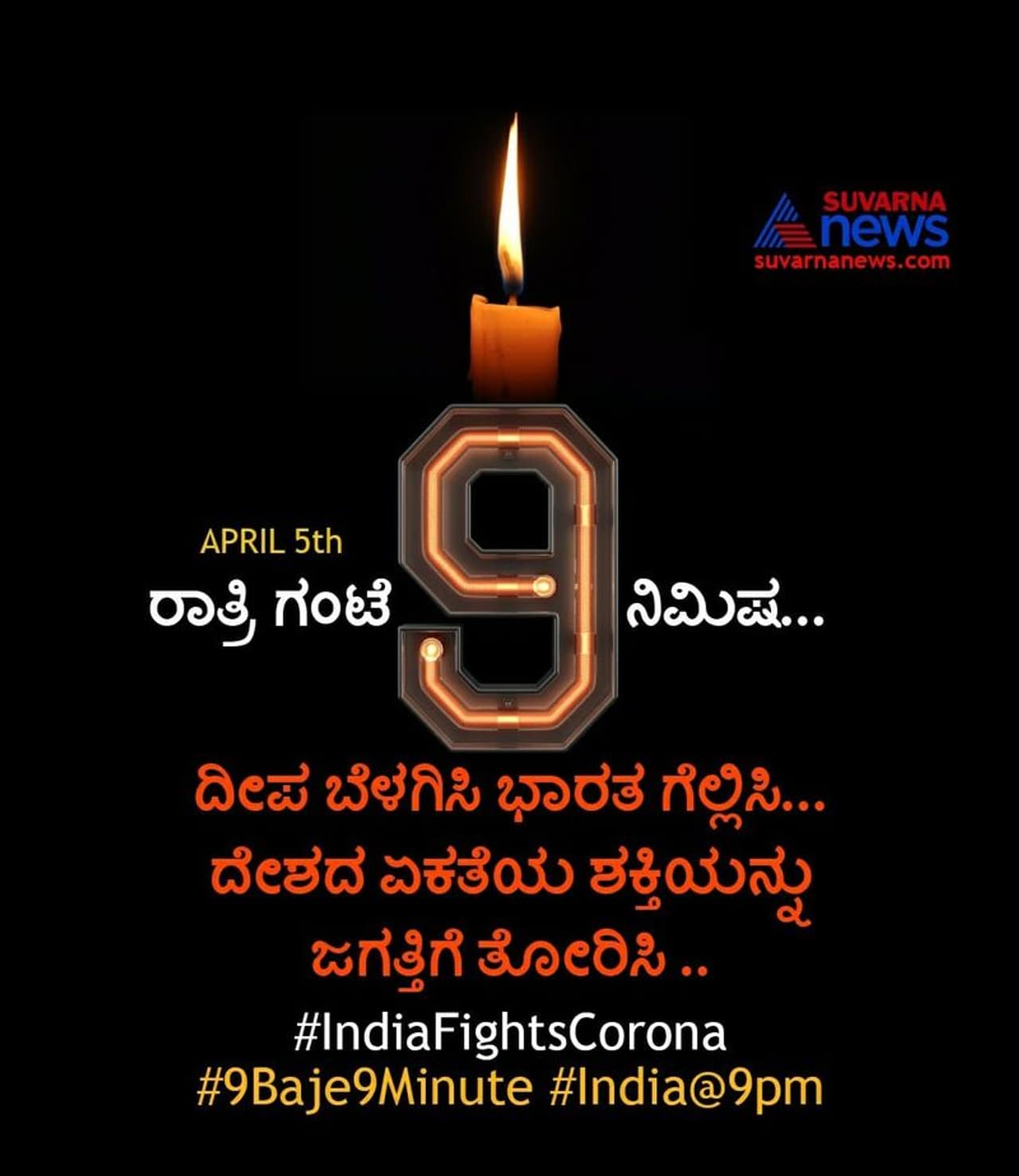 ಹಚ್ಚೋಣ ಏಕತಾ ದೀಪ| ಇಂದು ರಾತ್ರಿ 9ರಿಂದ 9 ನಿಮಿಷಗಳ ಕಾಲ ಬೆಳಕಿನ ಅಭಿಯಾನ| 130 ಕೋಟಿ ಜನರು ಒಗ್ಗಟ್ಟಿನ ಮಂತ್ರ ಜಪಿಸಲು ಕರೆ ನೀಡಿರುವ ಪ್ರಧಾನಿ ನರೇಂದ್ರ ಮೋದಿ| ಕೊರೋನಾ ವಿರುದ್ಧ ಸಮರಕ್ಕೆ ಉತ್ಸಾಹ ತುಂಬುವ ಅಭಿಯಾನಕ್ಕೆ ಭಾರೀ ಪ್ರತಿಕ್ರಿಯೆ ಸಾಧ್ಯತೆ