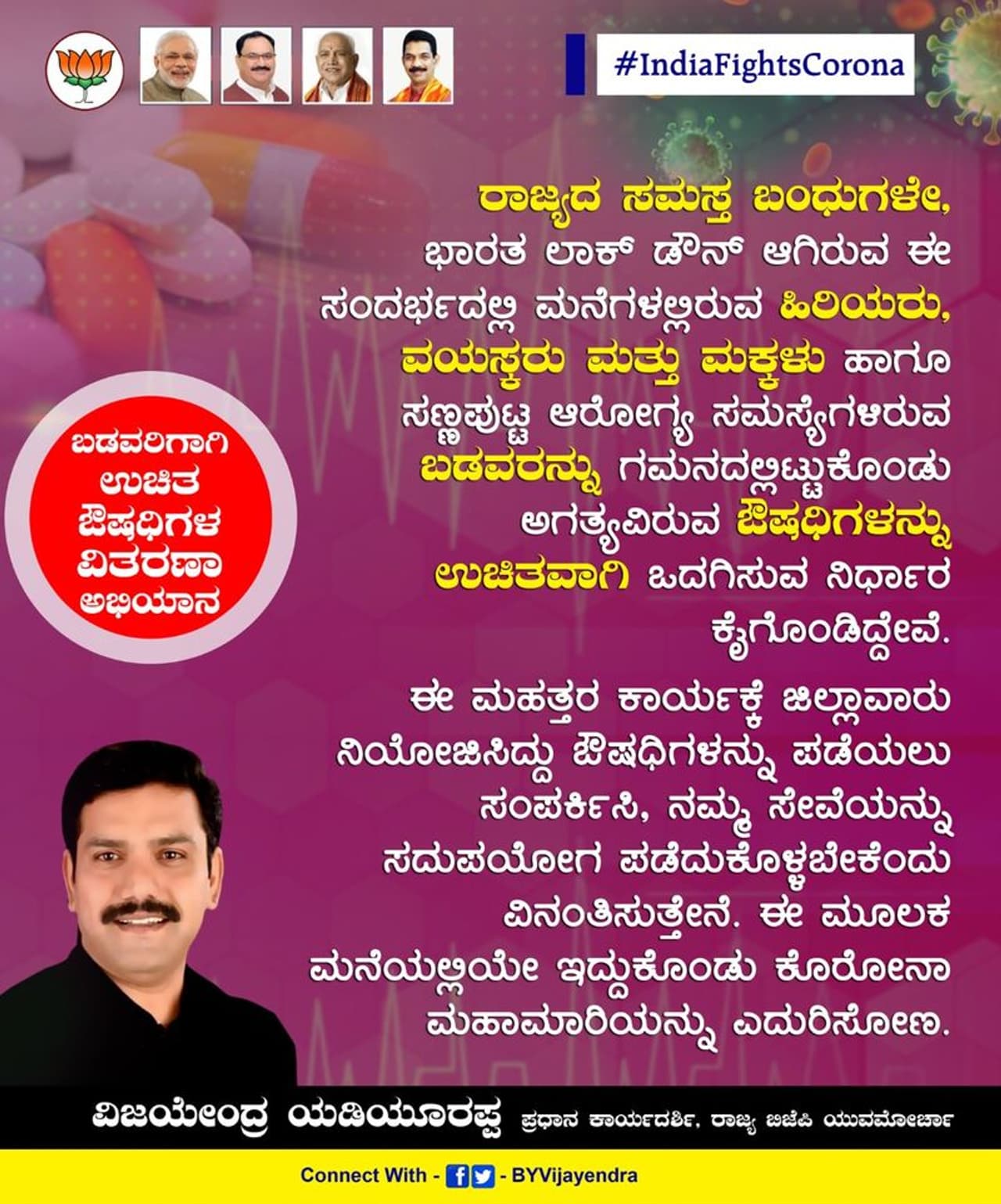 ಬೆಂಗಳೂರು(ಏ.03): ಕೊರೋನಾ ವೈರಸ್ ಭೀತಿಯಿಂದಾಗಿ ಪ್ರಧಾನಿ ನರೇಂದ್ರ ಮೋದಿ ದೇಶಾದ್ಯಂತ 21 ದಿನಗಳ ಲಾಕ್ಡೌನ್ ಘೋಷಣೆ ಮಾಡಿದ್ದಾರೆ. ಹೀಗಾಗಿ ಕೆಲವರು ಔಷಧಿಗಳನ್ನು ತರಲು ಪರದಾಡುತ್ತಿದ್ದಾರೆ. ಹೀಗಿರುವಾಗಲೇ ರಾಜ್ಯ ಬಿಜೆಪಿ ಯುವ ಮೋರ್ಚಾದ ಪ್ರಧಾನ ಕಾರ್ಯದರ್ಶಿ ಬಿ ವೈ ವಿಜಯೇಂದ್ರ ಆರೋಗ್ಯ ಸಮಸ್ಯೆ ಇರುವ ಬಡವರಿಗೆ ಉಚಿತವಾಗಿ ಔಷಧಿಗಳನ್ನು ವಿತರಿಸಲು ಮುಂದಾಗಿದ್ದಾರೆ.
