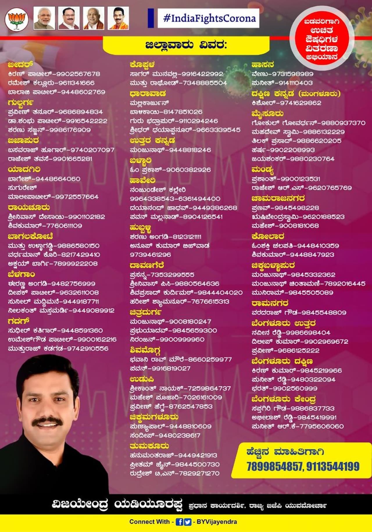 ಲಾಕ್ಡೌನ್ ಬೆನ್ನಲ್ಲೇ ಅಗತ್ಯ ಔಷಧಿ ತರಲು ಒದ್ದಾಡುತ್ತಿರುವವರ ನೆರವಿಗೆ ರಾಜ್ಯ ಬಿಜೆಪಿ ಯುವ ಮೋರ್ಚಾದ ಪ್ರಧಾನ ಕಾರ್ಯದರ್ಶಿ ಬಿ ವೈ ವಿಜಯೇಂದ್ರ ಮುಂದೆ ಬಂದಿದ್ದಾರೆ. ಅಗತ್ಯವಿವವರ ಮನೆಗೆ ಉಚಿತವಾಗಿ ಔಷಧಿ ತಲುಪಿಸುವ ಕೆಲಸಕ್ಕೆ ವಿಜಯೇಂದ್ರ ಕೈಹಾಕಿದ್ದಾರೆ.
