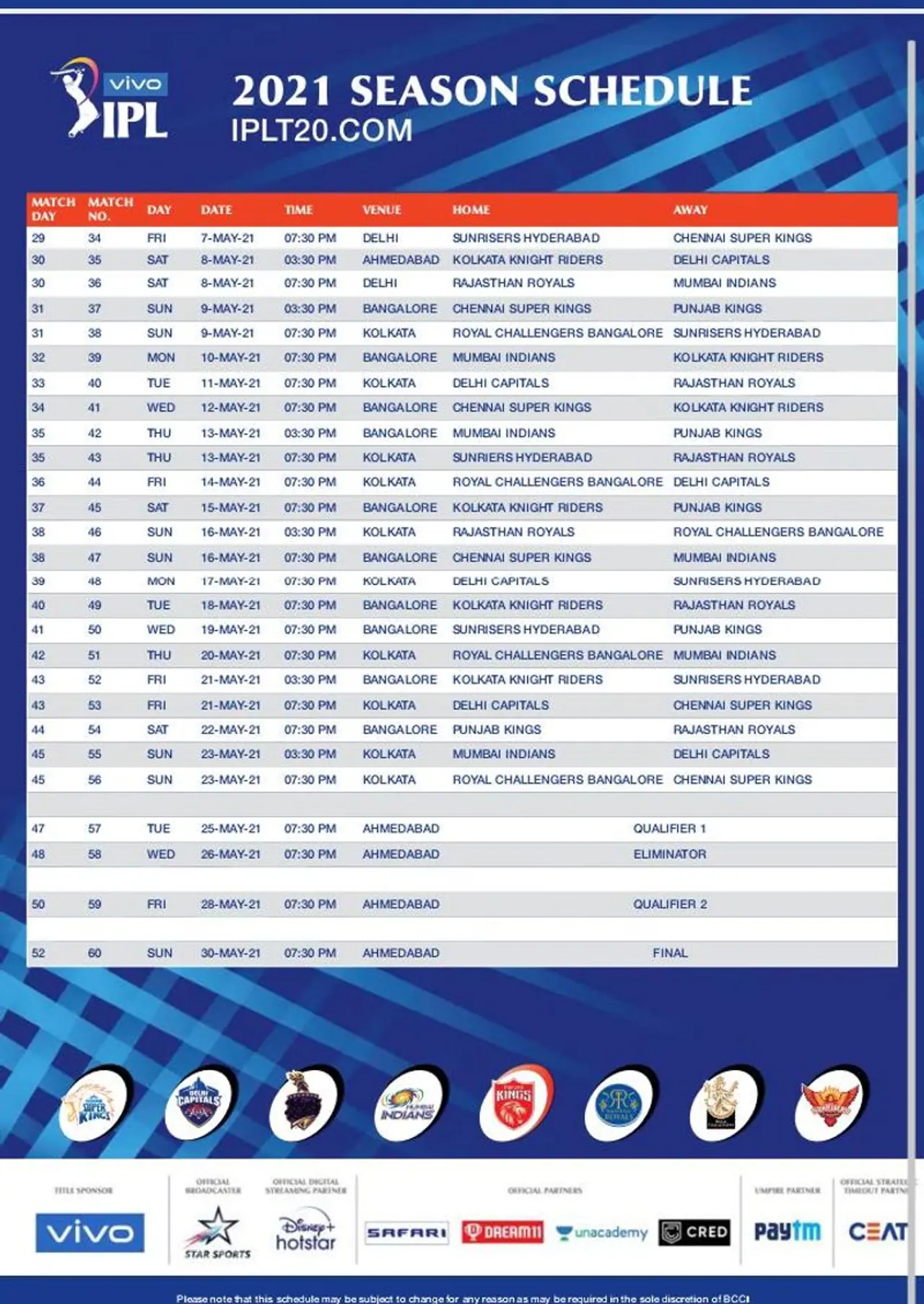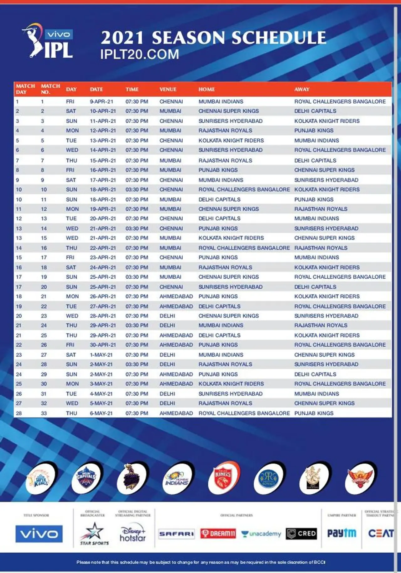 ಐಪಿಎಲ್ 2021ರ ವೇಳಾಪಟ್ಟಿ ಪ್ರಕಟ| ಚೆನ್ನೈನಲ್ಲಿ ಮೊದಲ ಪಂದ್ಯ, ಮೋದಿ ಸ್ಟೇಡಿಯಂನಲ್ಲಿ ಫೈನಲ್| ಇಲ್ಲಿದೆ ನೋಡಿ ಸಂಪೂರ್ಣ ವೇಳಾಪಟ್ಟಿ