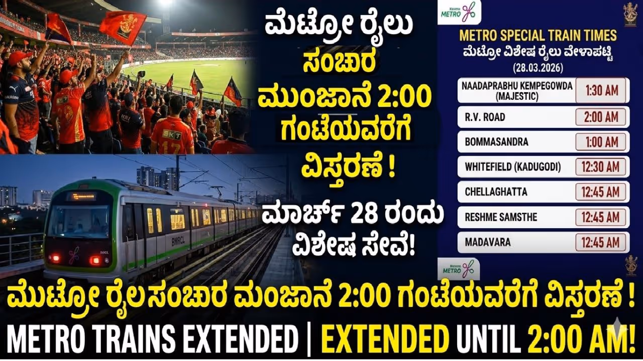 ಬೆಂಗಳೂರಿನಲ್ಲಿ ನಡೆಯಲಿರುವ ಐಪಿಎಲ್ 2026 ಪಂದ್ಯದ ಪ್ರಯುಕ್ತ, ಕ್ರಿಕೆಟ್ ಪ್ರೇಮಿಗಳ ಅನುಕೂಲಕ್ಕಾಗಿ ಬಿಎಂಆರ್ಸಿಎಲ್ ಮೆಟ್ರೋ ರೈಲು ಸಂಚಾರದ ಅವಧಿಯನ್ನು ತಡರಾತ್ರಿಯವರೆಗೆ ವಿಸ್ತರಿಸಿದೆ. ಪಂದ್ಯದ ಟಿಕೆಟ್ನಲ್ಲಿಯೇ ಕ್ಯೂಆರ್ ಕೋಡ್ ಪ್ರಯಾಣ ಸೌಲಭ್ಯ ವಿಶೇಷ ಪಾರ್ಕಿಂಗ್ ವ್ಯವಸ್ಥೆಯನ್ನು ಸಹ ಕಲ್ಪಿಸಲಾಗಿದೆ.