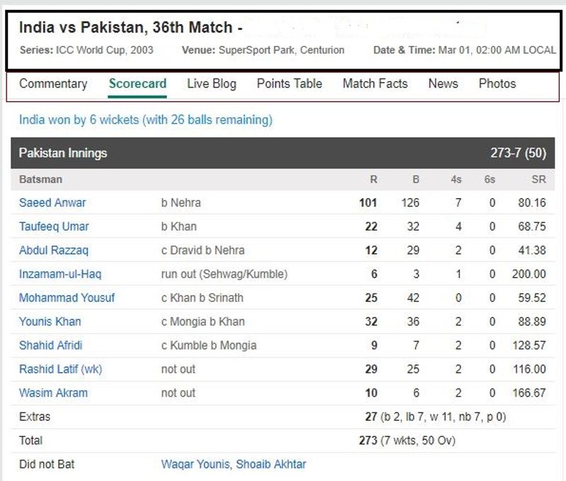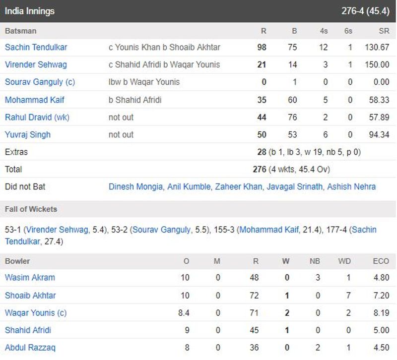 ಮೊದಲು ಬ್ಯಾಟಿಂಗ್ ಮಾಡಿದ್ದ ಪಾಕಿಸ್ತಾನ 7 ವಿಕೆಟ್ ನಷ್ಟಕ್ಕೆ 273 ರನ್ ಸಿಡಿಸಿತ್ತು. ಸಯಿದ್ ಅನ್ವರ್ 101 ರನ್ ಸಿಡಿಸಿ ಮಿಂಚಿದ್ದರು. ಜಹೀರ್ ಖಾನ್ ಹಾಗೂ ಆಶಿಶ್ ನೆಹ್ರಾ ತಲಾ 2 ವಿಕೆಟ್ ಕಬಳಿಸಿದ್ದರು. ಭಾರತ ಗೆಲುವಿಗೆ 274 ಗುರಿ ನೀಡಲಾಗಿತ್ತು.