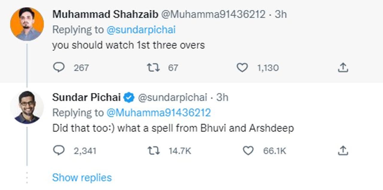 ಸುಂದರ್ ಪಿಚೈ ಟ್ವೀಟ್ಗೆ ರಿಪೈ ಮಾಡಿದ್ದ ಶಹಜೈಬ್, ನಾನು ಭಾರತ ತಂಡದ ಬ್ಯಾಟಿಂಗ್ನ ಮೊದಲ ಮೂರು ಓವರ್ ಬಗ್ಗೆ ಮಾತನಾಡುತ್ತಿದ್ದೇನೆ ಎಂದು ಟ್ವೀಟ್ ಮಾಡಿದ್ದ. ಇದಕ್ಕೆ ಪ್ರತಿಕ್ರಿಯೆ ನೀಡಿರುವ ಇನ್ನೊಬ್ಬ, ವಾದ ಮಾಡಲು ಹೋಗಬೇಡ, ಇಂಥ ದೊಡ್ಡ ವ್ಯಕ್ತಿ ರಿಪ್ಲೈ ಮಾಡಿದ್ದಾರಲ್ಲ ಅದಕ್ಕಾಗಿ ಖುಷಿ ಪಡು (Google CEO Sunder Pichai) ಎಂದು ಬರೆದಿದ್ದಾರೆ.