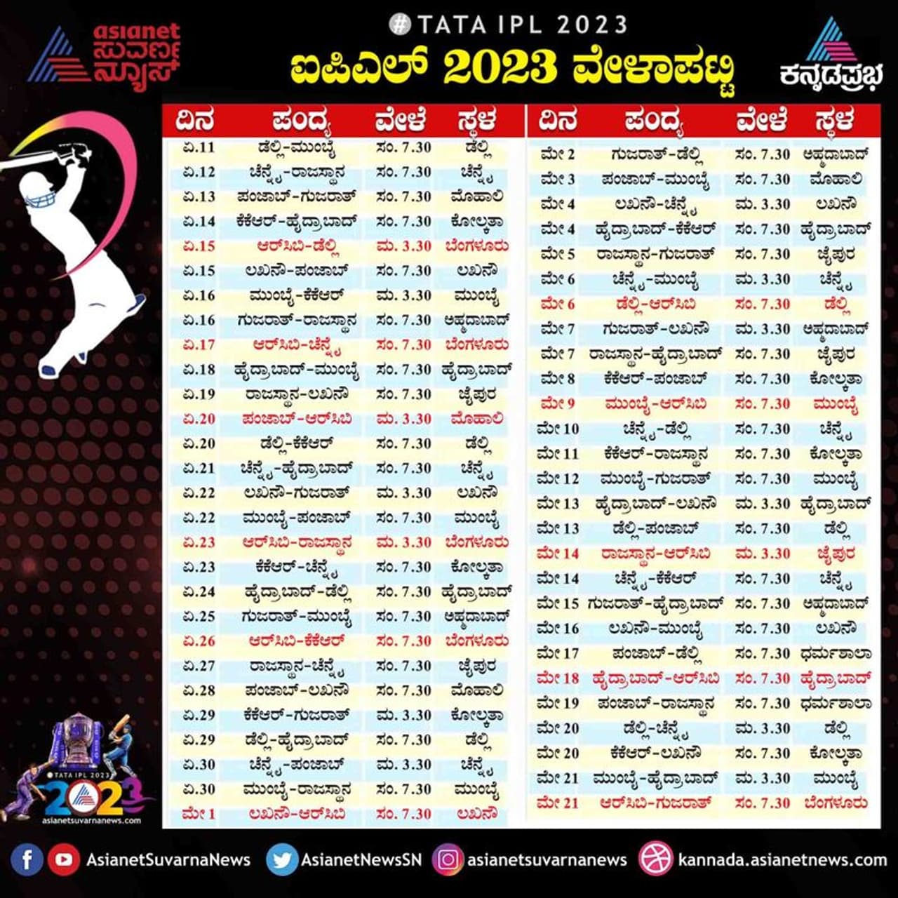 IPL ಟೂರ್ನಿಯ ಸಂಪೂರ್ಣ ವೇಳಾಪಟ್ಟಿ ಇಲ್ಲಿದೆ ನೋಡಿ: