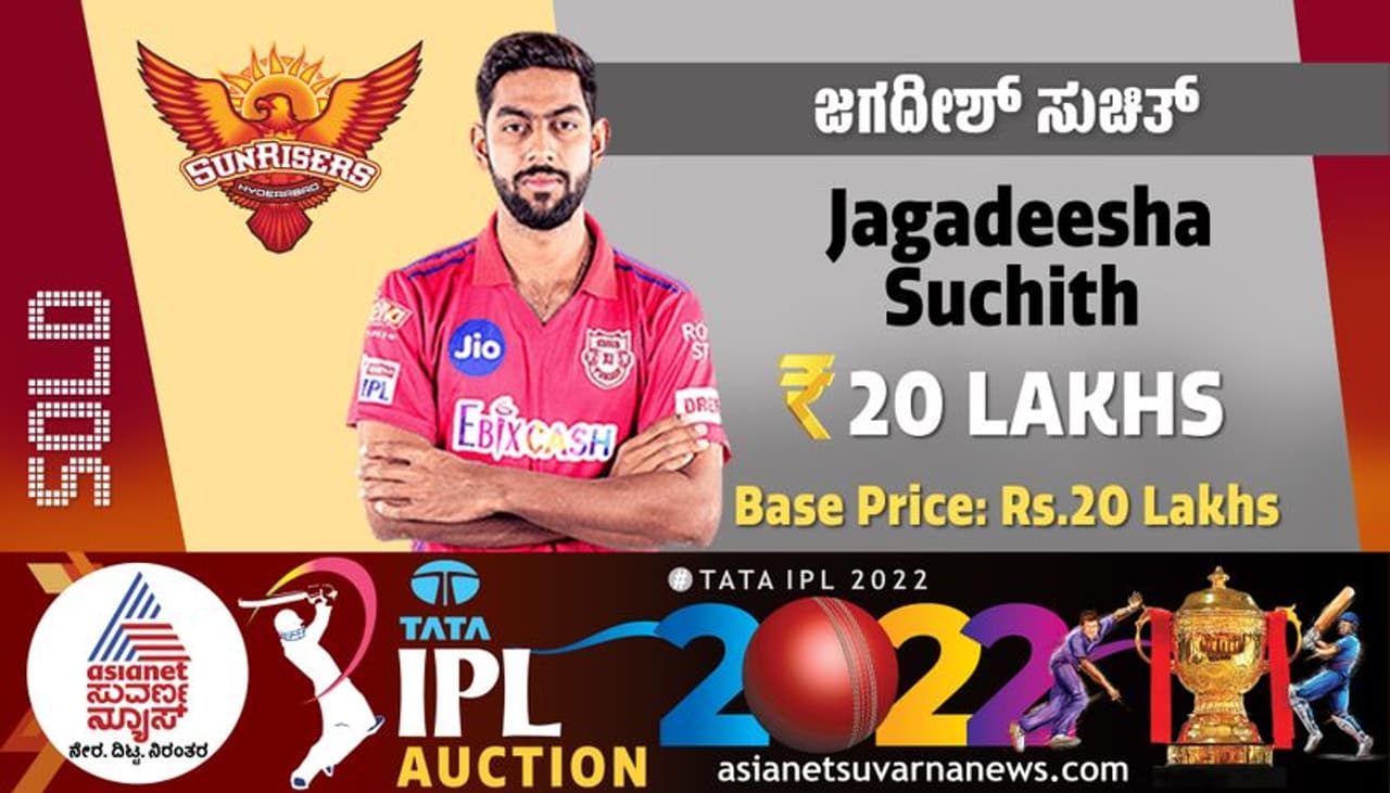 ಮತ್ತೊರ್ವ ಕನ್ನಡಿಗ ಜೆ ಸುಚಿತ್ 20 ಲಕ್ಷ ರೂಪಾಯಿ ಮೂಲ ಬೆಲೆಯಲ್ಲಿ ಸನ್ರೈಸರ್ಸ್ ಹೈದರಾಬಾದ್ ತಂಡ ಖರೀದಿಸಿದೆ.ಜಗದೀಶಾ ಸುಚಿತ್ 2015ರಲ್ಲಿ ಐಪಿಎಲ್ ಟೂರ್ನಿಗೆ ಪದಾರ್ಪಣೆ ಮಾಡಿದ್ದಾರೆ. ಮುಂಬೈ ಇಂಡಿಯನ್ಸ್ ತಂಡದ ಮೂಲಕ ಐಪಿಎಲ್ಗೆ ಎಂಟ್ರಿಕೊಟ್ಟ ಜಗದೀಶ್ ಕಳೆದ ಆವೃತ್ತಿಯಲ್ಲಿ ಸನ್ರೈಸರ್ಸ್ ಹೈದರಾಬಾದ್ ಪರರ ಆಡಿದ್ದರು. ಐಪಿಎಲ್ ಟೂರ್ನಿಯಲ್ಲಿ ಒಟ್ಟು 17 ಪಂದ್ಯಗಳನ್ನು ಆಡಿರುವ ಸುಚಿತ್ 52 ಓವರ್ ಬೌಲಿಂಗ್ ಮಾಡಿದ್ದಾರೆ. ಈ ಮೂಲಕ 13 ವಿಕೆಟ್ ಕಬಳಿಸಿದ್ದಾರೆ. ಸುಚಿತ್ ಪ್ರತಿಭಾನ್ವಿತ ಬೌಲರ್ ಅನ್ನೋದರಲ್ಲಿ ಎರಡು ಮಾತಿಲ್ಲ. ಆದರೆ 2015ರಲ್ಲಿ ಸುಚಿತ್ಗೆ ಹೆಚ್ಚಿನ ಅವಕಾಶ ಸಿಕ್ಕಿತ್ತು. 13 ಐಪಿಎಲ್ ಪಂದ್ಯಗಳನ್ನು ಆಡಿ 10 ವಿಕೆಟ್ ಕಬಳಿಸಿದ್ದರು. ಆದರೆ ಉಳಿದ ಆವೃತ್ತಿಗಳಲ್ಲಿ ಸುಚಿತ್ಗೆ ಅಕಾಶವೇ ಸಿಗಲಿಲ್ಲ. 2016ರಲ್ಲಿ ಒಂದು ಪಂದ್ಯ, 2019ರಲ್ಲಿ 1 ಪಂದ್ಯ ಹಾಗೂ ಕಳೆದ ಆವತ್ತಿಯಲ್ಲಿ ಕೇವಲ 2 ಪಂದ್ಯ ಆಡಿದ್ದಾರೆ.