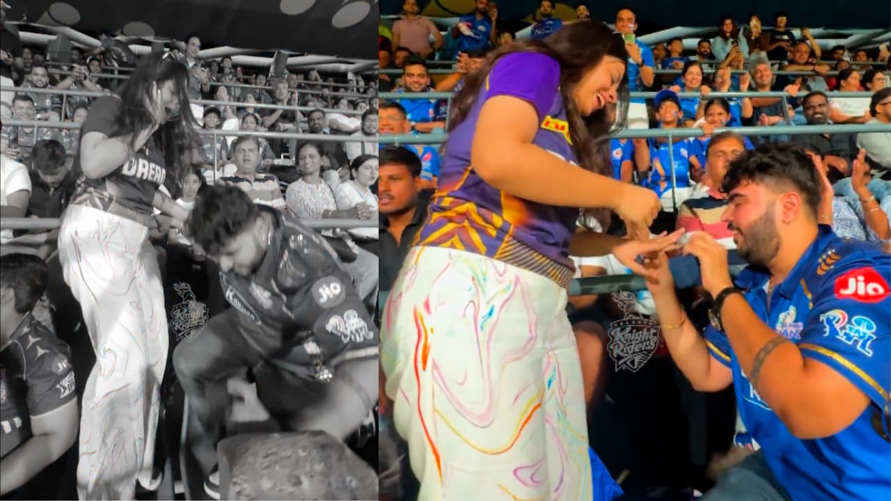 ಮುಂಬೈ ಅಭಿಮಾನಿಯಿಂದ ಕೆಕೆಆರ್ ಗೆಳತಿಗೆ ಪ್ರಪೋಸ್ ಮುನ್ನ ಕಳೆದೊಯ್ತು ರಿಂಗ್, ಮುಂದೇನಾಯ್ತು? ಪಂದ್ಯ ನಡೆಯುತ್ತಿದ್ದಂತೆ ನಿವೇದನೆ ಮಾಡಲು ಮಂಡಿಯೂರಿದ್ದಾನೆ. ಆದರೆ ಆಯತಪ್ಪಿದ ಕಾರಣ ರಿಂಗ್ ಕಳೆದುಹೋಗಿದೆ. ಮುಂದಾಗಿದ್ದೆ ರೋಚಕ