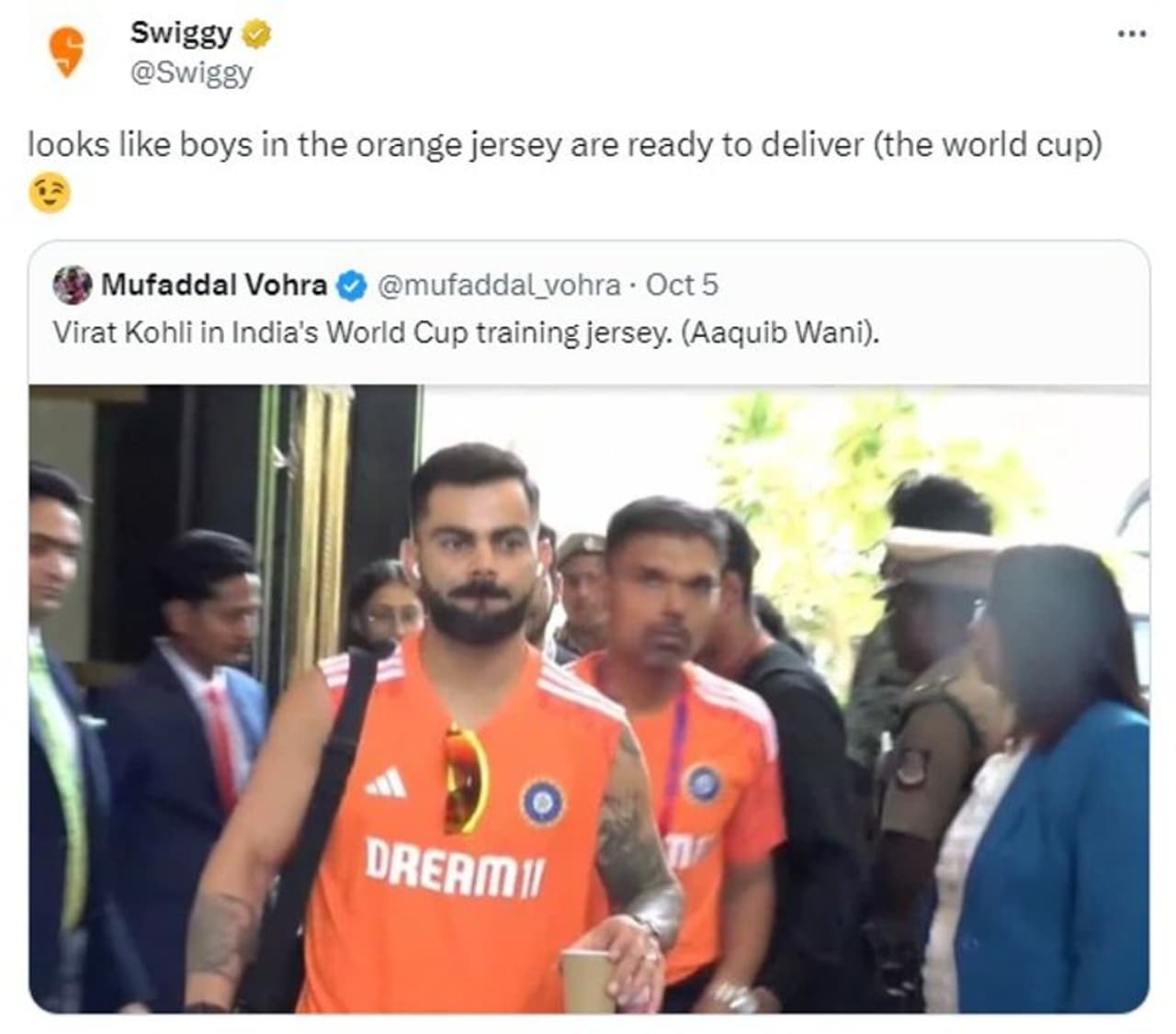 ದೇಶ ಪ್ರಖ್ಯಾತ ಫುಡ್ ಡೆಲಿವರಿ ಆಪ್ಗಳಲ್ಲಿ ಒಂದಾಗಿರುವ ಸ್ವಿಗ್ಗಿ ಕೂಡ ಈ ಕುರಿತಾದ ಚರ್ಚೆಯಿಂದ ಹೊರಗುಳಿಯಲಿಲ್ಲ. ಟೀಮ್ ಇಂಡಿಯಾ ಆಟಗಾರರು ಅಭ್ಯಾಸದ ಸಮಯದಲ್ಲಿ ಸ್ವಿಗ್ಗಿ ಡೆಲಿವರಿ ಬಾಯ್ ರೀತಿ ಕಾಣುತ್ತಿದ್ದಾರೆ ಎಂದು ಸೋಶಿಯಲ್ ಮೀಡಿಯಾದಲ್ಲಿ ಚರ್ಚೆ ಆಗುತ್ತಿರುವ ಸಮಯದಲ್ಲಿಯೇ ತಮಾಷೆಯಾಗಿ ಟ್ವೀಟ್ ಮಾಡಿದ ಸ್ವಿಗ್ಗಿ, 'ಕೇಸರಿ ಬಣ್ಣದ ಜೆರ್ಸಿ ಧರಿಸಿರುವ ನಮ್ಮ ಬಾಯ್ಸ್ ವಿಶ್ವಕಪ್ ಡೆಲಿವರಿ ಮಾಡಲು ರೆಡಿಯಾಗಿದ್ದಾರೆ' ಎಂದು ಟ್ವೀಟ್ ಮಾಡಿದೆ. ಸ್ವಿಗ್ಗಿಯ ಈ ತಮಾಷೆಯ ಟ್ವೀಟ್ ವಿಶ್ವಕಪ್ನಲ್ಲಿ ಟೀಮ್ ಇಂಡಿಯಾದ ಸಿದ್ದತೆಯ ಎಕ್ಸೈಟ್ಮೆಂಟ್ಅನ್ನು ಹೆಚ್ಚಿಸಿದೆ.