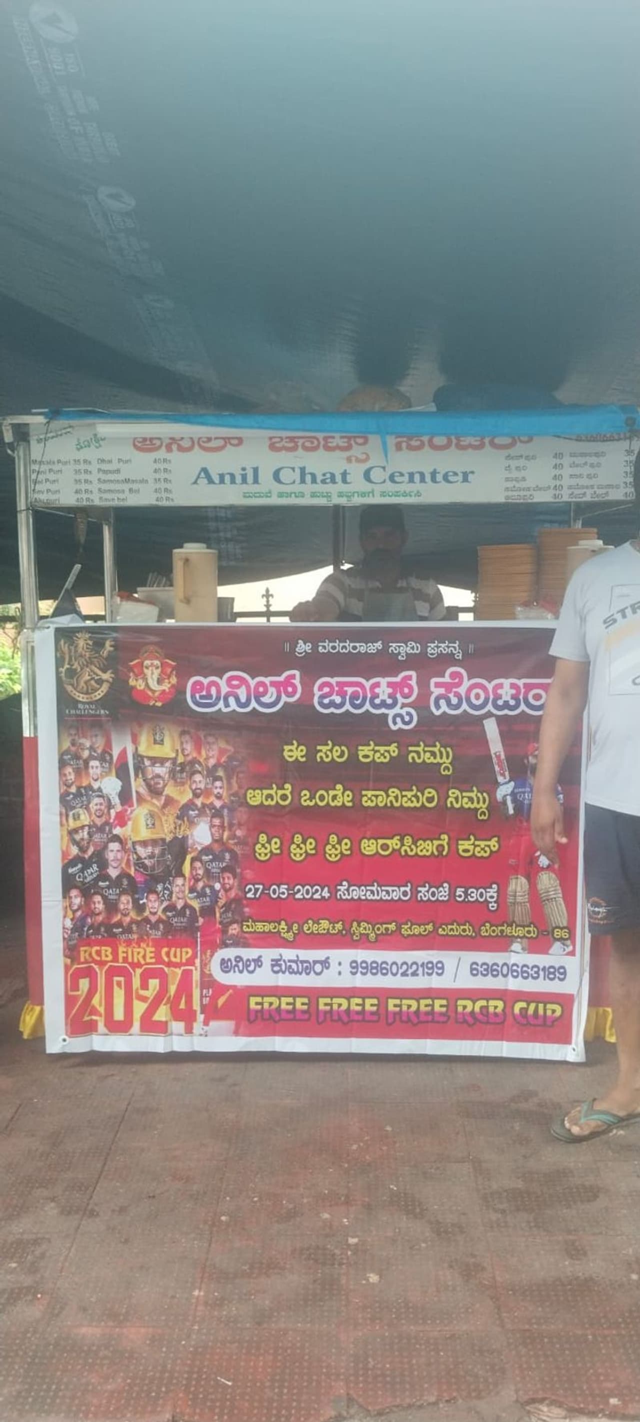 ಇದೀಗ ರಾಯಲ್ ಚಾಲೆಂಜರ್ಸ್ ಬೆಂಗಳೂರು ತಂಡದ ಅಪ್ಪಟ ಅಭಿಮಾನಿ ಅನಿಲ್ ಚಾಟ್ಸ್ ಸೆಂಟರ್ ಮಾಲೀಕರು, ಆರ್ಸಿಬಿ ಐಪಿಎಲ್ ಕಪ್ ಗೆದ್ರೆ ಇಡೀ ದಿನ ಉಚಿತವಾಗಿ ಆರ್ಸಿಬಿ ಫ್ಯಾನ್ಸ್ಗೆ ಪಾನಿಪೂರಿ ಸರ್ವಿಸ್ ನೀಡಲು ಮುಂದಾಗಿದ್ದಾರೆ. ಈಗಾಗಲೇ ತಮ್ಮ ಅಂಗಡಿ ಮುಂದೆ ಈ ಬಗ್ಗೆ ಅನಿಲ್ ಚಾಟ್ಸ್ ಸೆಂಟರ್ ಮಾಲೀಕರು ಬ್ಯಾನರ್ ಅಳವಡಿಸಿ ಗಮನ ಸೆಳೆದಿದ್ದಾರೆ.