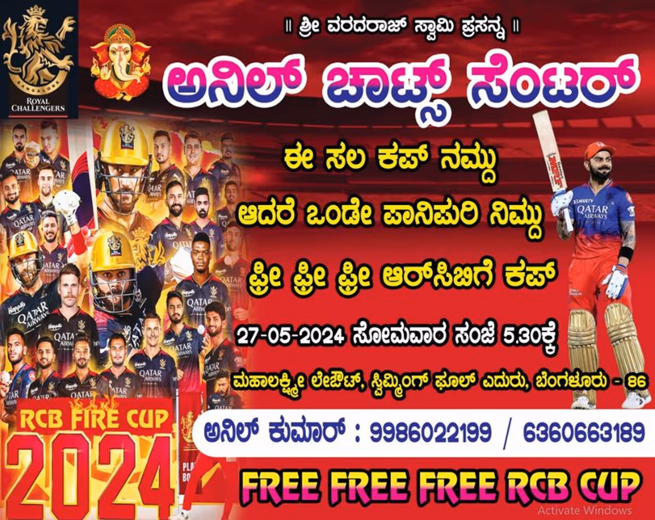 ಹೌದು, ಬೆಂಗಳೂರಿನ ಮಹಾಲಕ್ಷ್ಮಿ ಲೇಔಟ್ನಲ್ಲಿರುವ ಅನಿಲ್ ಚಾಟ್ಸ್ ಸೆಂಟರ್ ಮಾಲೀಕರಾದ ಅನಿಲ್ ಕುಮಾರ್ ಅವರು ಈ ಆಫರ್ ಘೋಷಿಸಿದ್ದಾರೆ. 17ನೇ ಆವೃತ್ತಿಯ ಐಪಿಎಲ್ ಟೂರ್ನಿಯ ಫೈನಲ್ ಪಂದ್ಯವು ಮೇ 26ರಂದು ಚೆನ್ನೈನಲ್ಲಿ ನಿಗದಿಯಾಗಿದೆ. ಒಂದು ವೇಳೆ ಆರ್ಸಿಬಿ ಫೈನಲ್ ಪ್ರವೇಶಿಸಿ ಕೋಲ್ಕತಾ ನೈಟ್ ರೈಡರ್ಸ್ ತಂಡವನ್ನು ಮಣಿಸಿ ಚೊಚ್ಚಲ ಐಪಿಎಲ್ ಟ್ರೋಫಿ ಜಯಿಸಿದರೆ, ಮರುದಿನ ಅಂದರೆ ಮೇ 27ರಂದು ಸಂಜೆ 5.30ರಿಂದ ಇಡೀ ದಿನ ಉಚಿತವಾಗಿ ಪಾನಿಪೂರಿ ಸರ್ವಿಸ್ ನೀಡುವುದಾಗಿ ಚಾಟ್ಸ್ ಸೆಂಟರ್ ಮಾಲೀಕರಾದ ಅನಿಲ್ ಕುಮಾರ್ ಘೋಷಿಸಿದ್ದಾರೆ.