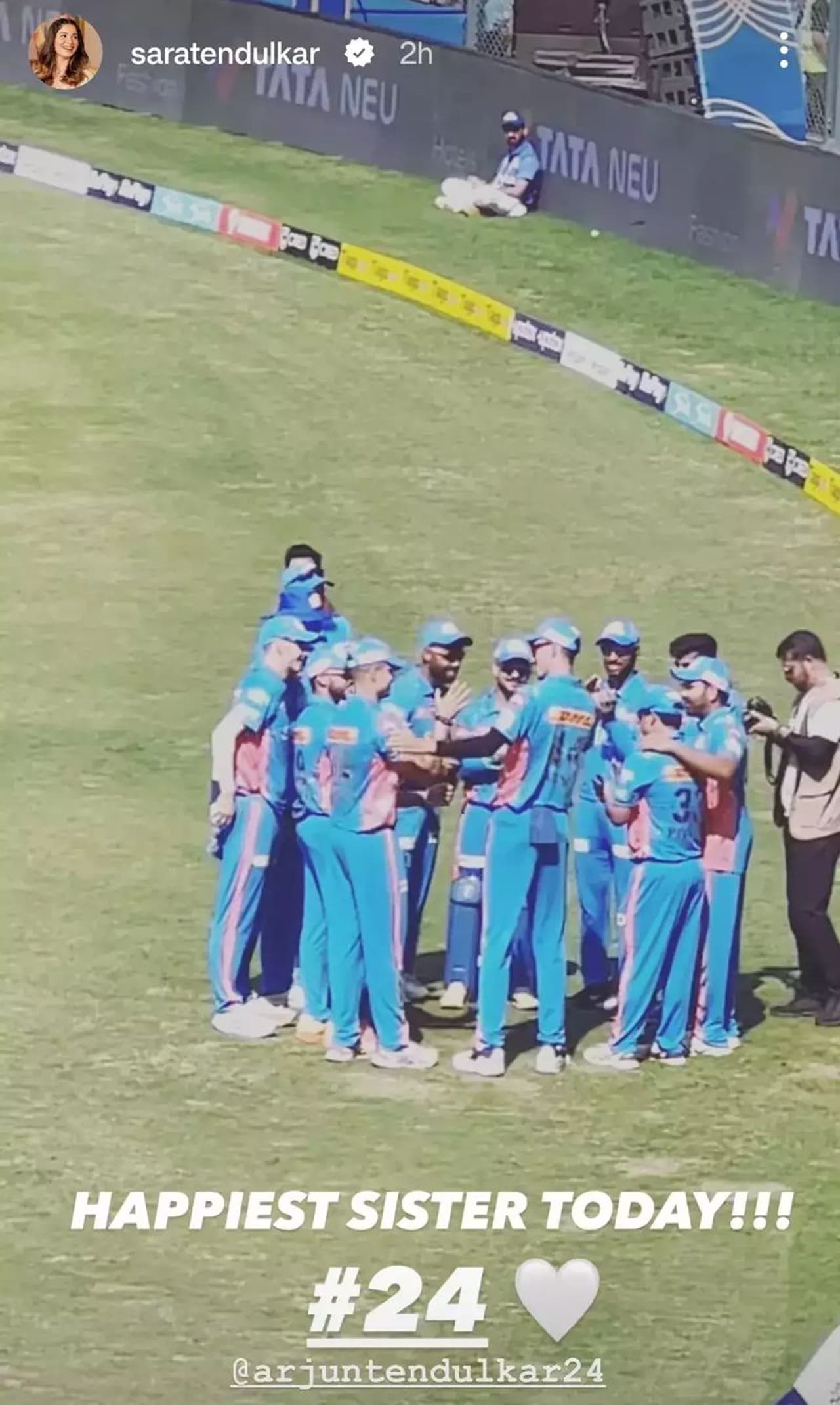 ಇನ್ನು ಅರ್ಜುನ್ ತೆಂಡುಲ್ಕರ್ ಹಿರಿಯ ಸಹೋದರಿ ಸಾರಾ ತೆಂಡುಲ್ಕರ್, ತಮ್ಮನ ಪಂದ್ಯವನ್ನು ವಾಂಖೇಡೆ ಮೈದಾನದಲ್ಲಿ ಬಂದು ಕಣ್ತುಂಬಿಕೊಂಡರು. ಇನ್ನು ಇದೇ ವೇಳೆ ತಮ್ಮ ಸೋದರ ಮುಂಬೈ ತಂಡದ ಕ್ಯಾಪ್ ಪಡೆಯುತ್ತಿರುವ ಕ್ಷಣದ ಫೋಟೋವನ್ನು ಹಂಚಿಕೊಳ್ಳುವುದರ ಜತೆಗೆ ಇದು ನಿನ್ನ ಸಹೋದರಿಯಾಗಿ ನನಗೆ ಅತ್ಯಂತ ಸಂತೋಷದ ಕ್ಷಣ ಎಂದು ಬರೆದು ಇನ್ಸ್ಟಾಗ್ರಾಂನಲ್ಲಿ ಸ್ಟೋರಿ ಶೇರ್ ಮಾಡಿದ್ದಾರೆ.