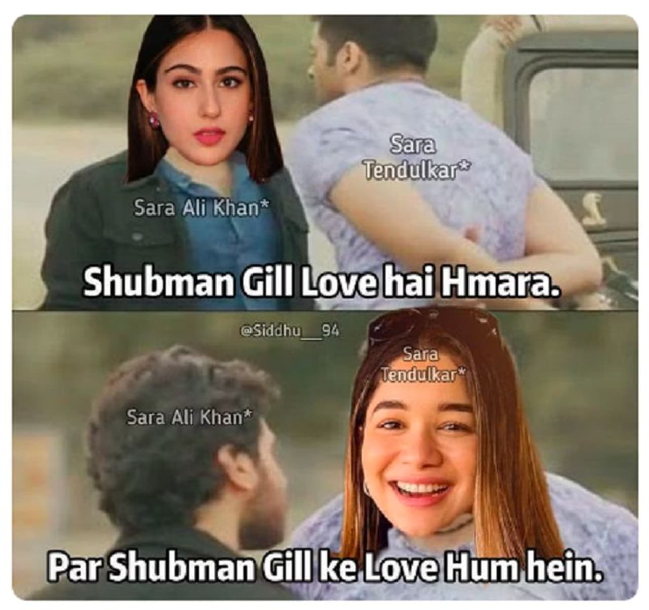'ವೋ ಸಾರಾ ನೇ ಬೋಲ್ ದಿಯಾ ಥಾ. ಪಾಪಾ ಕೋ ಖುಷ್ ಕರ್ನಾ. ಹೇ ತೋ ಉನ್ಕೇ ಜೈಸೇ ಸೆಂಚುರೀಸ್ ಲಗಾಕೆ ದಿಖಾವೋ' (ಅದು ಸಾರಾ ಹೇಳಿದ್ದಳು. ಅಪ್ಪನನ್ನು ಖುಷಿ ಪಡಿಸಿ ಅಂತಾ. ಅಥವಾ ಅವರ ರೀತಿಯಲ್ಲಿ ಶತಕಗಳನ್ನು ಹೊಡೆದು ತೋರಿಸಿ ಅಂತಾ)' ಅದಕ್ಕಾಗಿಯೇ ಶುಭ್ಮನ್ ಗಿಲ್ ಈ ರೀತಿಯ ಇನ್ನಿಂಗ್ಸ್ ಆಡಿದ್ದಾರಂತೆ. 'ನನ್ನ ಬ್ಯಾಗ್ನಲ್ಲಿ ಬಾಬಾ ನೀಡಿದ್ದ ಪ್ರಸಾದವನ್ನು ನೀನು ತಿಂದೆ ಅಂತಾ ಕಾಣುತ್ತದೆ' ಎಂದು ಸ್ವತಃ ವಿರಾಟ್ ಕೊಹ್ಲಿ ಶುಭ್ಮನ್ ಗಿಲ್ಗೆ ಹೇಳುತ್ತಿರುವ ರೀತಿ ಇನ್ನೊಬ್ಬರು ಮೀಮ್ ಹಂಚಿಕೊಂಡಿದ್ದಾರೆ. ಶುಭ್ ಮನ್ ಗಿಲ್ಗಾಗಿ ಸಾರಾ ತೆಂಡುಲ್ಕರ್ ಹಾಗೂ ಸಾರಾ ಅಲಿ ಖಾನ್, ಮಿರ್ಜಾಪುರ್ ವೆಬ್ ಸಿರೀಸ್ ಸ್ಟೈಲ್ ಅಲ್ಲಿ ಈ ರೀತಿ ಮಾತನಾಡಿಕೊಳ್ಳಬಹುದು ಎಂದು ಮೀಮ್ ಹಂಚಿಕೊಂಡಿದ್ದಾರೆ.