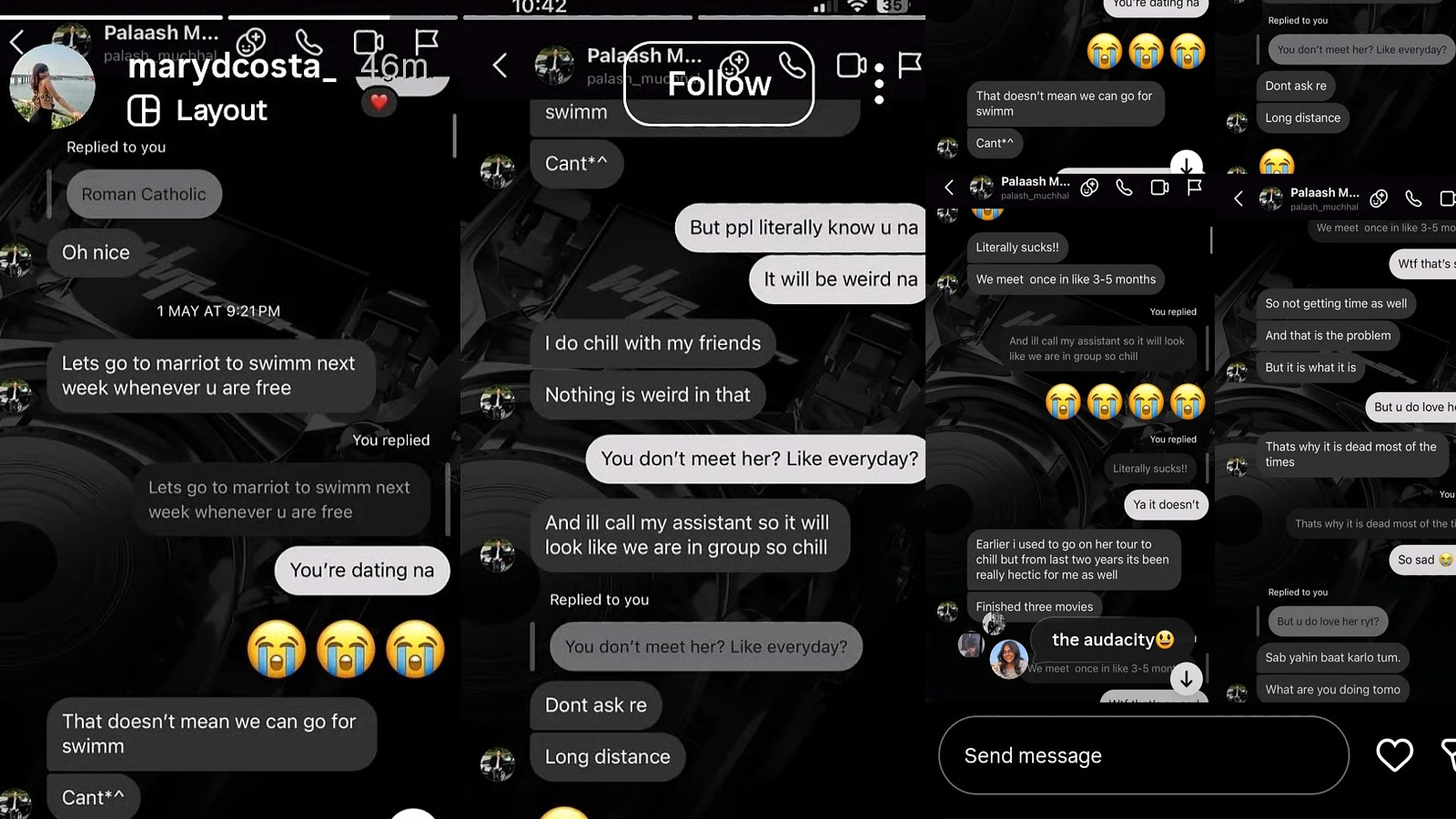 ಮೇರಿ ಡಿ'ಕೋಸ್ಟಾ ಎನ್ನುವ ಮಹಿಳೆ ಈ ಸ್ಕ್ರೀನ್ಶಾಟ್ ಅನ್ನು ತಮ್ಮ ಇನ್ಸ್ಟಾಗ್ರಾಂ ಸ್ಟೋರಿಯಲ್ಲಿ ಹಂಚಿಕೊಂಡಿದ್ದಾರೆ. ಈ ಚಾಟ್ನಲ್ಲಿ ಪಲಾಶ್ ಮುಚ್ಚಲ್, ಸ್ಮೃತಿ ಮಂಧನಾ ಜತೆಗಿನ ಲಾಂಗ್ ಡಿಸ್ಟೆನ್ಸ್ ರಿಲೇಷನ್ಶಿಪ್ ಹಾಗೂ ಆಕೆಯ ಜತೆ ಟೂರ್ ಹೋಗುವುದರ ಬಗ್ಗೆ ಆಗುವ ಸವಾಲುಗಳ ಬಗ್ಗೆ ಪಲಾಶ್ ಮುಚ್ಚಲ್ ಚಾಟ್ ಮಾಡಿದ್ದಾರೆ.