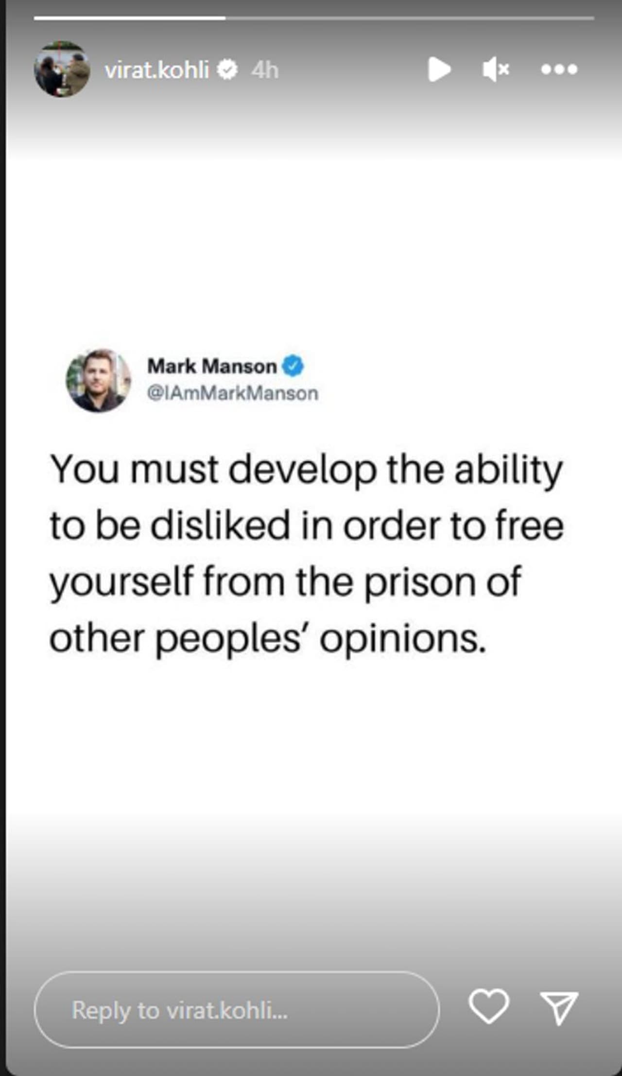 ಇನ್ನು ವಿಶ್ವ ಟೆಸ್ಟ್ ಚಾಂಪಿಯನ್ಶಿಪ್ ಮೂರನೇ ದಿನದಾಟ ಆರಂಭಕ್ಕೂ ಮುನ್ನ ವಿರಾಟ್ ಕೊಹ್ಲಿ, ಗೂಢಾರ್ಥದ ಟ್ವೀಟ್ ಮಾಡಿ ಟೀಕಾಕಾರರ ಬಾಯಿ ಮುಚ್ಚಿಸಿದ್ದಾರೆ. "ಇತರ ಜನರ ಅಭಿಪ್ರಾಯಗಳ ಸೆರೆಮನೆಯಿಂದ ನಿಮ್ಮನ್ನು ಮುಕ್ತಗೊಳಿಸಲು ನೀವು ಇಷ್ಟಪಡದಿರುವ ಸಾಮರ್ಥ್ಯವನ್ನು ಬೆಳೆಸಿಕೊಳ್ಳಬೇಕು" ಎನ್ನುವ ಪೋಸ್ಟ್ ಹಂಚಿಕೊಂಡಿದ್ದಾರೆ.