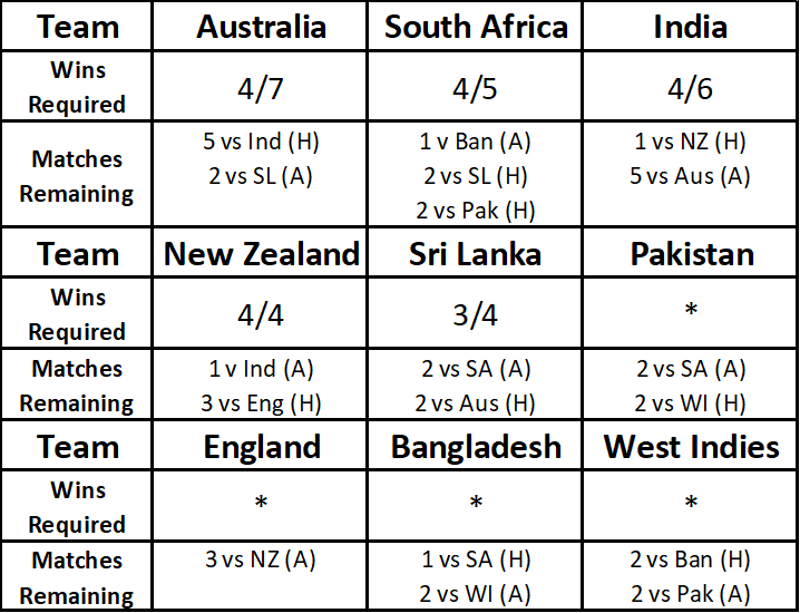 ಇನ್ನುಳಿದಂತೆ ನ್ಯೂಜಿಲೆಂಡ್ ಭಾರತ ಎದುರು ಒಂದು ಹಾಗೂ ಇಂಗ್ಲೆಂಡ್ ಎದುರು 3 ಪಂದ್ಯವನ್ನು ಜಯಿಸಿದರೆ ವಿಶ್ವ ಟೆಸ್ಟ್ ಚಾಂಪಿಯನ್ಶಿಪ್ ಫೈನಲ್ ಪ್ರವೇಶಿಸಲಿದೆ. ಇನ್ನುಳಿದಂತೆ ಶ್ರೀಲಂಕಾ ತಂಡವು ದಕ್ಷಿಣ ಆಫ್ರಿಕಾ ಹಾಗೂ ಆಸ್ಟ್ರೇಲಿಯಾ ಎದುರು ತಲಾ ಎರಡು ಸೇರಿದಂತೆ ಒಟ್ಟು 4 ಪಂದ್ಯಗಳನ್ನು ಆಡಲಿದ್ದು, ಮೂರು ಪಂದ್ಯ ಜಯಿಸಿದರೆ ಫೈನಲ್ಗೆ ಅರ್ಹತೆ ಪಡೆಯಲಿದೆ. ಇನ್ನು ಪಾಕಿಸ್ತಾನ, ಇಂಗ್ಲೆಂಡ್, ಬಾಂಗ್ಲಾದೇಶ ಹಾಗೂ ವೆಸ್ಟ್ ಇಂಡೀಸ್ ತಂಡಗಳು ಈಗಾಗಲೇ ವಿಶ್ವ ಟೆಸ್ಟ್ ಚಾಂಪಿಯನ್ಶಿಪ್ ಫೈನಲ್ ರೇಸ್ನಿಂದ ಹೊರಬಿದ್ದಿವೆ.
