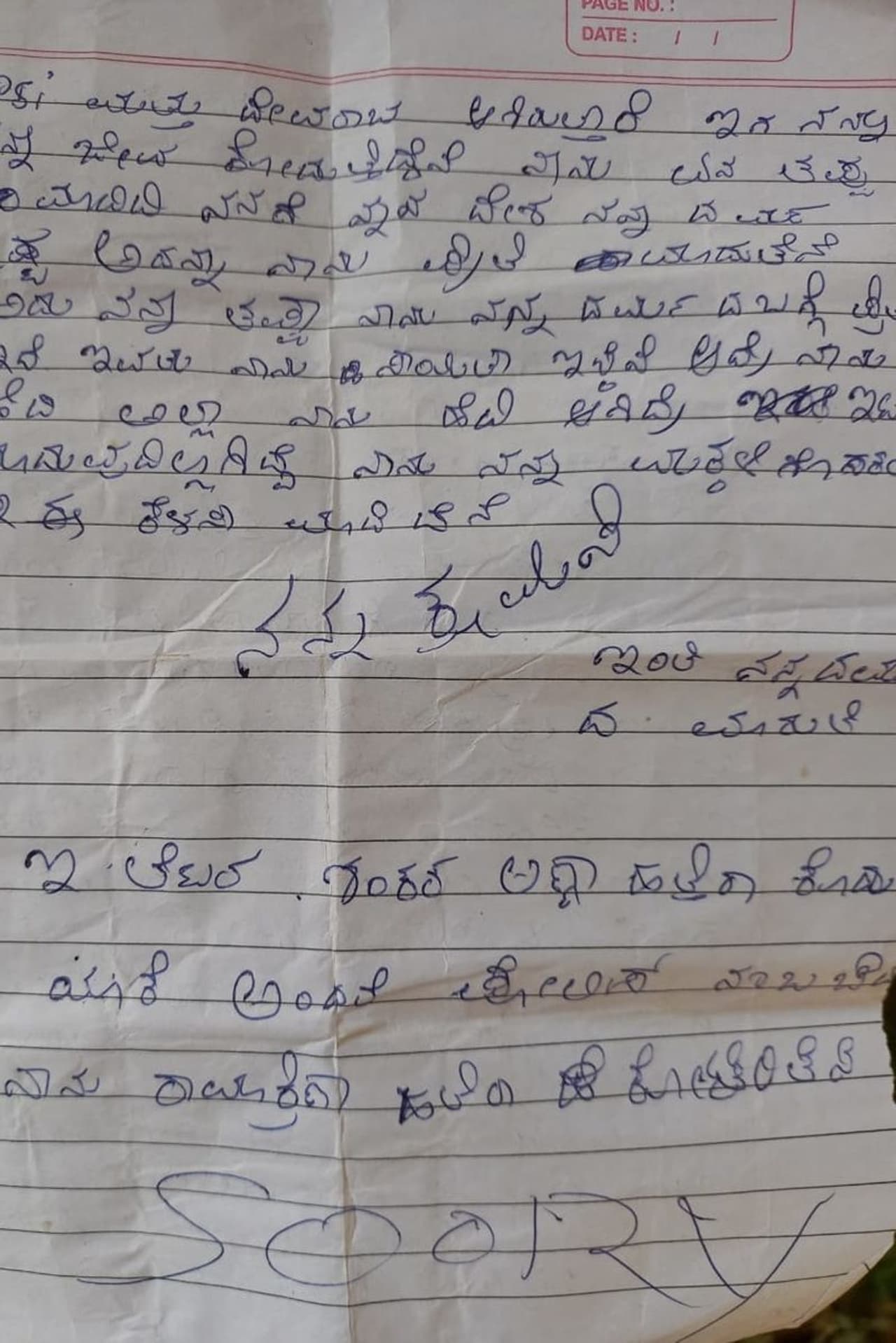 ಸಿಪಿಐ ಕುಸುಮಾಧರ್, ಪಿಎಸ್ಐ ಹಾಗೂ ಸಿಬ್ಬಂದಿ ದೇವರಾಜ್ ದೌರ್ಜನ್ಯದಿಂದ ನಾನು ಜೀವ ಕೊಡುತ್ತಿದ್ದೇನೆ. ನಾನು ನನ್ನ ದೇಶ, ಧರ್ಮವನ್ನು ಪ್ರೀತಿಸ್ತೇನೆ... ಅದು ನನ್ನ ತಪ್ಪಾ...? ನಾನು ಹೇಡಿಯಲ್ಲ, ಹೇಡಿಯಾಗಿದ್ರೆ ಈ ಕೆಲಸ ಮಾಡ್ತಿರ್ಲಿಲ್ಲ. ನನ್ನ ಮಕ್ಕಳಿಗಾಗಿ ನಾನು ಈ ಕೆಲಸ ಮಾಡ್ತಿದ್ದೇನೆ. ನನ್ನನ್ನು ಕ್ಷಮಿಸಿ..ಈ ಲೆಟರ್ ಅನ್ನು ಶಂಕರ್ ಅಣ್ಣಾನತ್ರ ಕೊಟ್ಟುಬಿಡಿ. ಇದಕ್ಕೆಲ್ಲಾ ಕಾರಣ ಸಿಪಿಐ ಕುಸುಮಾಧರ್, ಪಿಎಸ್ಐ, ದೇವರಾಜ ಹಾಗೂ ಎಲಿಷಾ ಎಲಕಪಾಟಿ. ನನ್ನ ಜನರಲ್ಲಿ ನಾನು ಕ್ಷಮೆ ಕೋರ್ತೇನೆ, ನಾನು ಮತ್ತೆ ಹುಟ್ಟಿ ಬರ್ತೇನೆ. ರಾಧಾ ನನ್ನನ್ನು ಕ್ಷಮಿಸಿ ಪ್ಲೀಸ್, ನಿನ್ನಂತ ಹೆಂಡತಿ ಪಡೆಯಲು ಪುಣ್ಯ ಮಾಡಿರಬೇಕು. ನಾನು ಸತ್ರೆ ಎಲ್ಲಾ ಸರಿಯಾಗುತ್ತೆ, ಶಂಕರ ಅಣ್ಣನತ್ರ ಹೇಳು ನನ್ನ ಸುಡು ಅಂತಾ, ಯಾಕಂದ್ರೆ ಅವನ ಬಿಟ್ರೆ ನನಗೆ ಯಾರೂ ಇಲ್ಲ. 100 ಜನುಮಕೂ ನೀನು ಬೇಕು, I love you Radha ಎಂದು ಡೆತ್ನೋಟ್ ಬರೆದಿಟ್ಟು ಮಾರುತಿ ನಾಯ್ಕ್ ಆತ್ಮಹತ್ಯೆ ಮಾಡಿಕೊಂಡಿದ್ದಾನೆ.