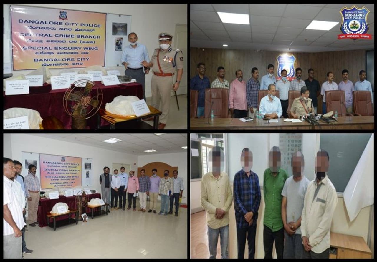 ಬೆಂಗಳೂರಿನ ಮಜೀಬ್ ಪಾಷಾ, ಮಹಮ್ಮದ್ ಮುನ್ನಾ, ಗುಲಾಬ್ ಚಂದ್ ಅಲಿಯಾಸ್ ಗುಡ್ಡು, ಸಂತೋಷ ಹಾಗೂ ಜಗನ್ನಾಥಾಚಾರ್ ಬಂಧಿತರಾಗಿದ್ದು, ಆರೋಪಿಗಳಿಂದ 80 ಕೆ.ಜಿ. ಅಂಬರ್ಗೀಸ್, ಬ್ರಿಟಿಷರ ಕಾಲದ ರೆಡ್ ಮರ್ಕ್ಯುರಿಯ 2 ತ್ರಾಮದ ಬಾಟಲ್, 1818ನೇ ಇಸವಿಯ ಸ್ಟೀಮ್ ಫ್ಯಾನ್ ಜಪ್ತಿ ಮಾಡಲಾಗಿದೆ. ಈ ಕಾರ್ಯಾಚರಣೆ ವೇಳೆ ತಪ್ಪಿಸಿಕೊಂಡಿರುವ ಪ್ರಮುಖ ಆರೋಪಿ ಪತ್ತೆಗೆ ತನಿಖೆ ನಡೆದಿದೆ ಎಂದು ಬೆಂಗಳೂರು ನಗರ ಪೊಲೀಸ್ ಆಯುಕ್ತ ಕಮಲ್ ಪಂತ್ ತಿಳಿಸಿದ್ದಾರೆ.