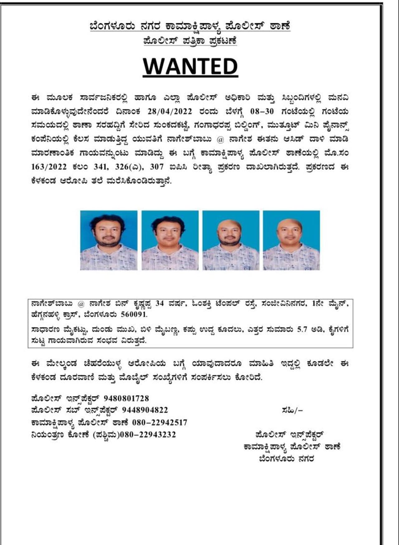 ತಲೆ ಕೂದಲು,ಗಡ್ಡ ಮೀಸೆ ಇದ್ದಾಗ ಹೇಗೆ ಕಾಣುತ್ತಾನೆ ಎಂಬ ಬಗ್ಗೆ ಒಂದು ಪೋಟೋ, ಗಡ್ಡ ತೆಗಿಸಿ, ಬರೀ ಕೂದಲು ಇದ್ದಾಗ ಹೇಗೆ ಕಾಣುತ್ತಾನೆ. ತಲೆ ಕೂದಲು ತೆಗಿಸಿ, ಗಡ್ಡ ಇದ್ದಾಗ ಹೇಗೆ ಕಾಣುತ್ತಾನೆ. ಗಡ್ಡ ,ಮೀಸೆ, ತಲೆ ಕೂದಲು ತೆಗೆದಾಗ ಹೇಗೆ ನಾಗೇಶ್ ಕಾಣುತ್ತಾನೆ ಎಂದು ಚಿತ್ರೀಸಿರುವ ಪೊಲೀಸರು, ನಾಲ್ಕು ಮಾದರಿಯ ಪೋಟೋಗಳನ್ನು ಬಿಡುಗಡೆ ಮಾಡಿದ್ದಾರೆ. ಇನ್ನು ಎಲ್ಲೇ ಆರೋಪಿ ನಾಗೇಶ್ ಕಂಡು ಬಂದರೆ ಮಾಹಿತಿ ನೀಡುವಂತೆ ಕಾಮಾಕ್ಷಿಪಾಳ್ಯ ಪೊಲೀಸರ ಮನವಿ ಮಾಡಿಕೊಂಡಿದ್ದಾರೆ.