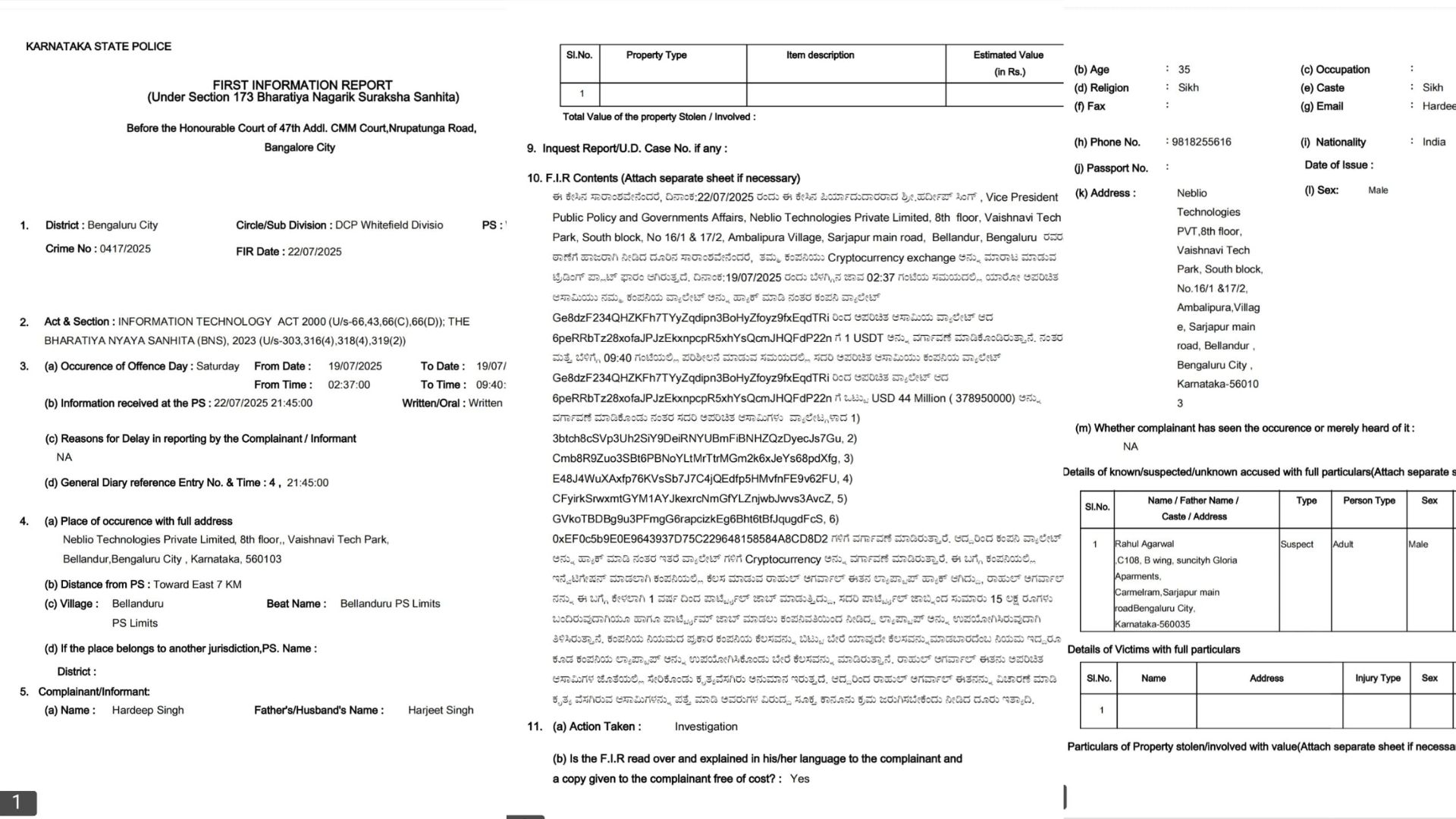 ನೆಬಿಲೊ ಟೆಕ್ನಾಲಜಿಸ್ ಕಂಪನಿಯು ಕ್ರಿಪ್ಟೋ ಕರೆನ್ಸಿ ಎಕ್ಸ್ಚೇಂಜ್ ಪ್ಲಾಟ್ಫಾರ್ಮ್ ಒದಗಿಸುವ ಕೆಲಸ ಮಾಡುತ್ತದೆ. ದೂರಿನ ಪ್ರಕಾರ, 19/7/2025 ರಂದು ಬೆಳಗಿನ ಜಾವ 2:37ಕ್ಕೆ ಕಂಪನಿಯ ವಾಲೆಟ್ನಿಂದ 1 USDT ಅನ್ನು ಅಪರಿಚಿತ ವಾಲೆಟ್ಗೆ ವರ್ಗಾವಣೆ ಮಾಡಲಾಗಿತ್ತು. ಮತ್ತೆ ಬೆಳಿಗ್ಗೆ 9:40ಕ್ಕೆ ಸೈಬರ್ ವಂಚಕರು ಸರ್ವರ್ಗೆ ಅಕ್ರಮವಾಗಿ ಪ್ರವೇಶಿಸಿ, 44 ಮಿಲಿಯನ್ USDT (378 ಕೋಟಿ ರೂ.) ವರ್ಗಾವಣೆ ಮಾಡಿದ್ದಾರೆ.