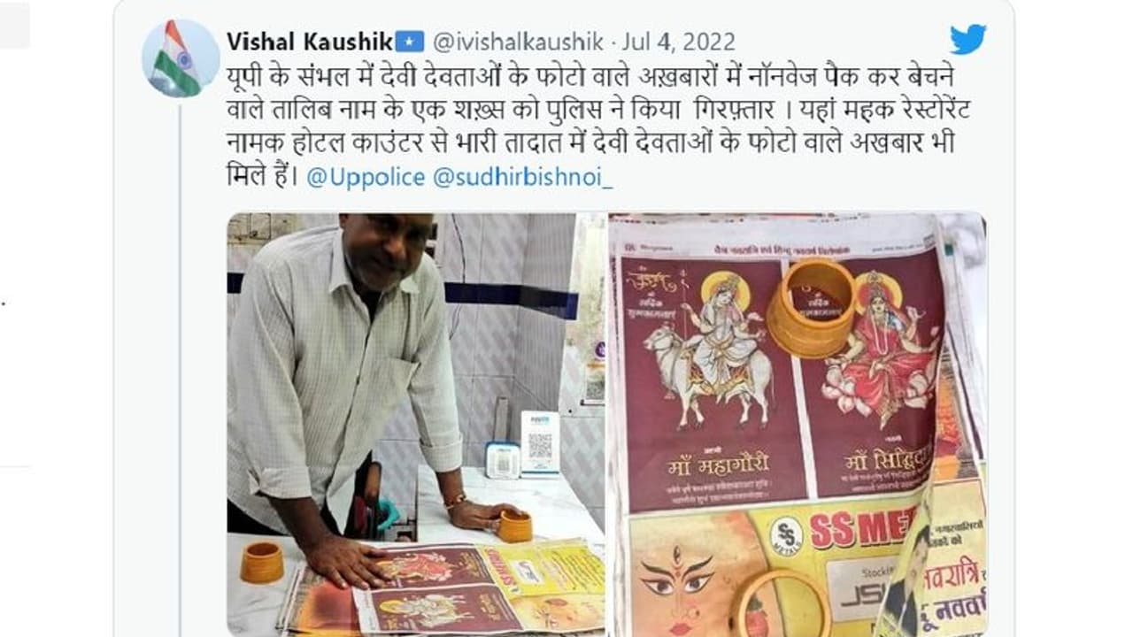 ಉತ್ತರಪ್ರದೇಶದಲ್ಲಿ ವ್ಯಕ್ತಿಯೊಬ್ಬ ಕೋಳಿ ಮಾಂಸದ ತುಂಡುಗಳನ್ನು ಹಿಂದೂ ದೇವತೆಗಳ ಚಿತ್ರವಿದ್ದ ಪೇಪರ್ನಲ್ಲಿ ಸುತ್ತಿ ಗ್ರಾಹಕರಿಗೆ ನೀಡಿದ್ದಾನೆ. ಇದು ವಿವಾದಕ್ಕೀಡಾಗಿದ್ದು, ಈ ಸಂಬಂಧ ವಿಚಾರಣೆಗೆ ಬಂದ ಪೊಲೀಸರ ಮೇಲೂ ಆತ ಹಲ್ಲೆ ನಡೆಸಿದ್ದಾನೆ. ಘಟನೆಗೆ ಸಂಬಂಧಿಸಿದಂತೆ ಈಗ ಪೊಲೀಸರು ಆರೋಪಿಯನ್ನು ಬಂಧಿಸಿದ್ದಾರೆ.