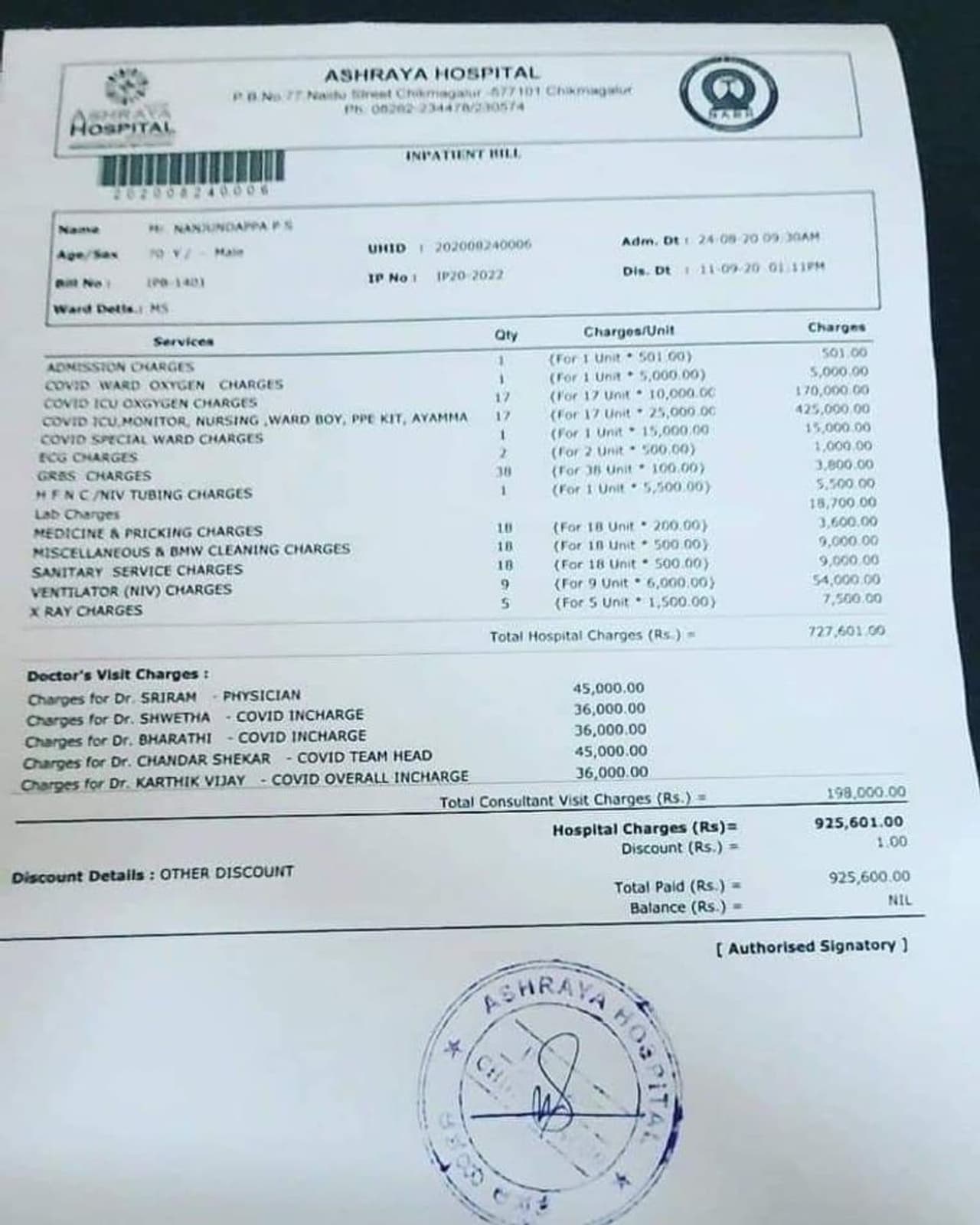 ವ್ಯಕ್ತಿಯ ಆರೈಕೆಗೆ ಆಸ್ಪತ್ರೆ ನೀಡಿರುವ ಬಿಲ್ 9,25,601 ರೂ. ಒಟ್ಟು ಬಿಲ್ ಮೊತ್ತದಲ್ಲಿ 1 ರೂಪಾಯಿ ವಿನಾಯಿತಿ! ಖಾಸಗಿ ಆಸ್ಪತ್ರೆಯ ಈ ಬಿಲ್ ಬಗ್ಗೆ ಸಾರ್ವಜನಿಕರಿಂದಲೂ ಭಾರೀ ಅಸಮಾಧಾನ ವ್ಯಕ್ತವಾಗಿದೆ. ಕುಟುಂಬಸ್ಥರು ಆಸ್ಪತ್ರೆಯ ವಿರುದ್ಧ ಆರೋಪಿಸಿ, ಜಿಲ್ಲಾಧಿಕಾರಿಗೆ ದೂರು ನೀಡಿದ್ದಾರೆ.