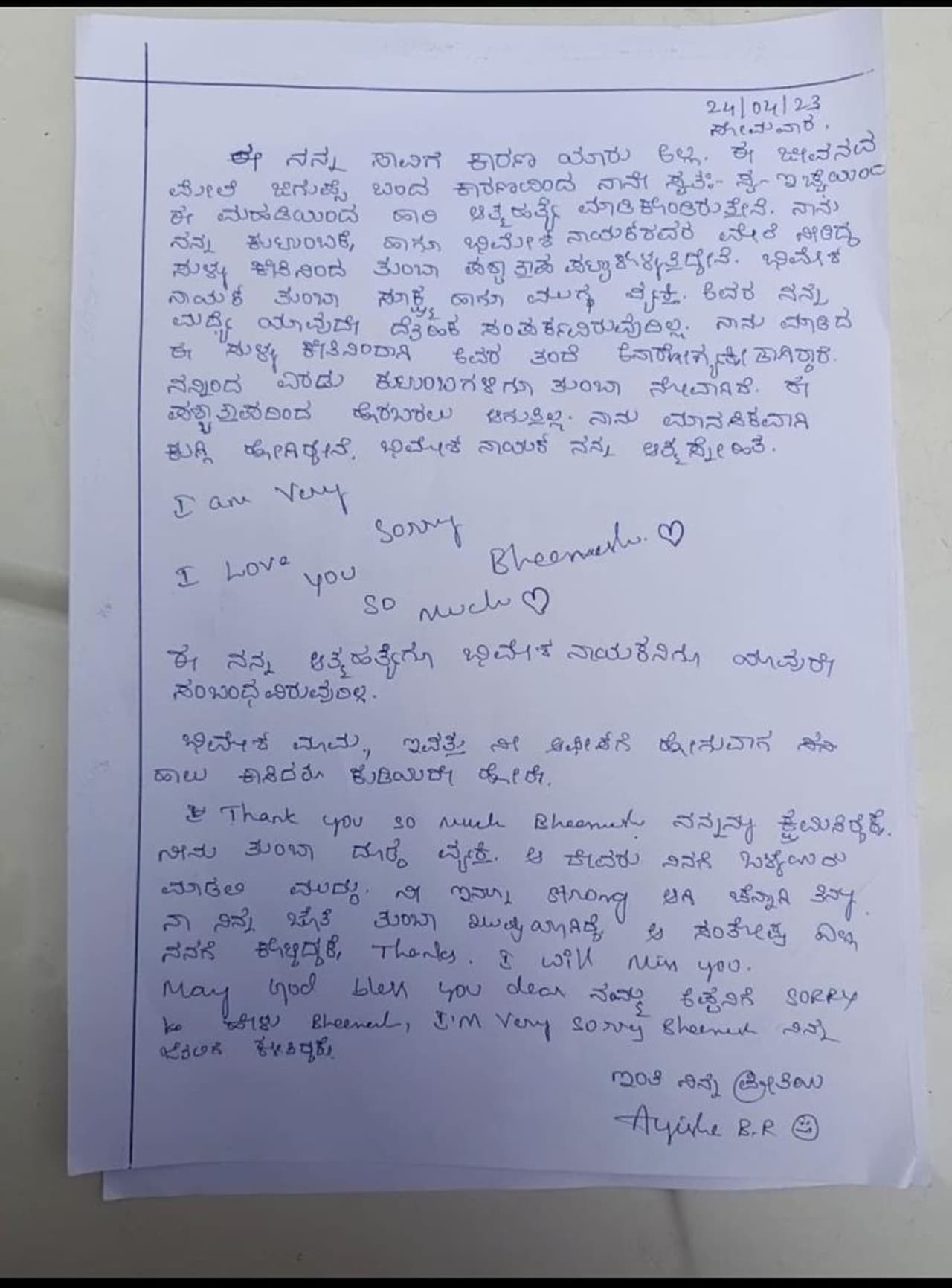 ಆದರೆ, ಯುವತಿ ತನ್ನ ಮೇಲೆ ಯಾವುದೇ ಅತ್ಯಾಚಾರ ನಡೆದಿಲ್ಲ ಎಂದು ಹೇಳಿಕೆ ನೀಡಿದ ಹಿನ್ನೆಲೆಯಲ್ಲಿ ಹೈಕೋರ್ಟ್ ನಲ್ಲಿ ಭೀಮೇಶ್ ಅತ್ಯಾಚಾರ ಪ್ರಕರಣ ಸ್ಕ್ವಾಶ್ ಆಗಿತ್ತು. ಇದಾದ ಬಳಿಕವೂ ಇಬ್ಬರ ಮಧ್ಯೆ ಸಂಬಂಧ ಮುಂದುವರೆದಿದೆ. ಇನ್ನು ಸದ್ಯ ಮಂಗಳೂರಿನ ಸೇಂಟ್ ಆಗ್ನೆಸ್ ಕಾಲೇಜಿನಲ್ಲಿ ಬಿ.ಆರ್. ಆಯಿಶಾ ಬಿ.ಎಸ್ಸಿ ಅಭ್ಯಾಸ ಮಾಡುತ್ತಿದ್ದಳು. ಆದರೆ, ಆಗಿಂದಾಗ್ಗೆ ಆಯಿಶಾ ಮಂಗಳೂರಿನಿಂದ ಬಂದು ಬೆಂಗಳೂರಿನಲ್ಲಿರುವ ಭೀಮೇಶ್ ಮನೆಯಲ್ಲಿ ಉಳಿದುಕೊಳ್ಳುತ್ತಿದ್ದಳು. ಆದರೆ, ನಿನ್ನೆ ಇಬ್ಬರಲ್ಲೂ ಸ್ವಲ್ಪ ವೈಮನಸ್ಸು ಬಂದಿರಬಹುದು. ಭೀಮೇಶ್ ಮತ್ತು ಆಯಿಶಾ ಪರಿಸ್ಪರ ತಮ್ಮ ಊರಿಗೆ ಹೋಗಲು ರೆಡಿಯಾಗಿದ್ದಾರೆ. ಈ ವೇಳೆ ಆಯಿಶಾ ಮೆಜೆಸ್ಟಿಕ್ ಬಸ್ ನಿಲ್ದಾಣದವರೆಗೂ ಹೋಗಿ, ಅಲ್ಲಿಂದ ವಾಪಸ್ ಬಂದು ಪೊಲೀಸ್ ಕ್ವಾಟ್ರಸ್ ಮೇಲಿಂದ ಬಿದ್ದು ಆತ್ಮಹತ್ಯೆ ಮಾಡಿಕೊಂಡಿದ್ದಾಳೆ.