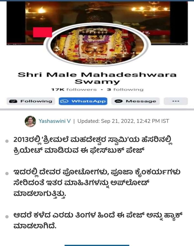 ಕಳೆದ ಎರಡು ತಿಂಗಳ ಹಿಂದೆ ಫೇಸ್ಬುಕ್ ಪೇಜ್ನ್ನು ಹ್ಯಾಕ್ ಮಾಡಲಾಗಿದೆ. ಸ್ಟೋರಿಗಳ ವಿಭಾಗದಲ್ಲಿ ಹುಡುಗಿಯರ ಅಶ್ಲೀಲ ಪೋಟೋ, ವಿಡಿಯೋ ಹಾಕಲಾಗುತ್ತಿದೆ.