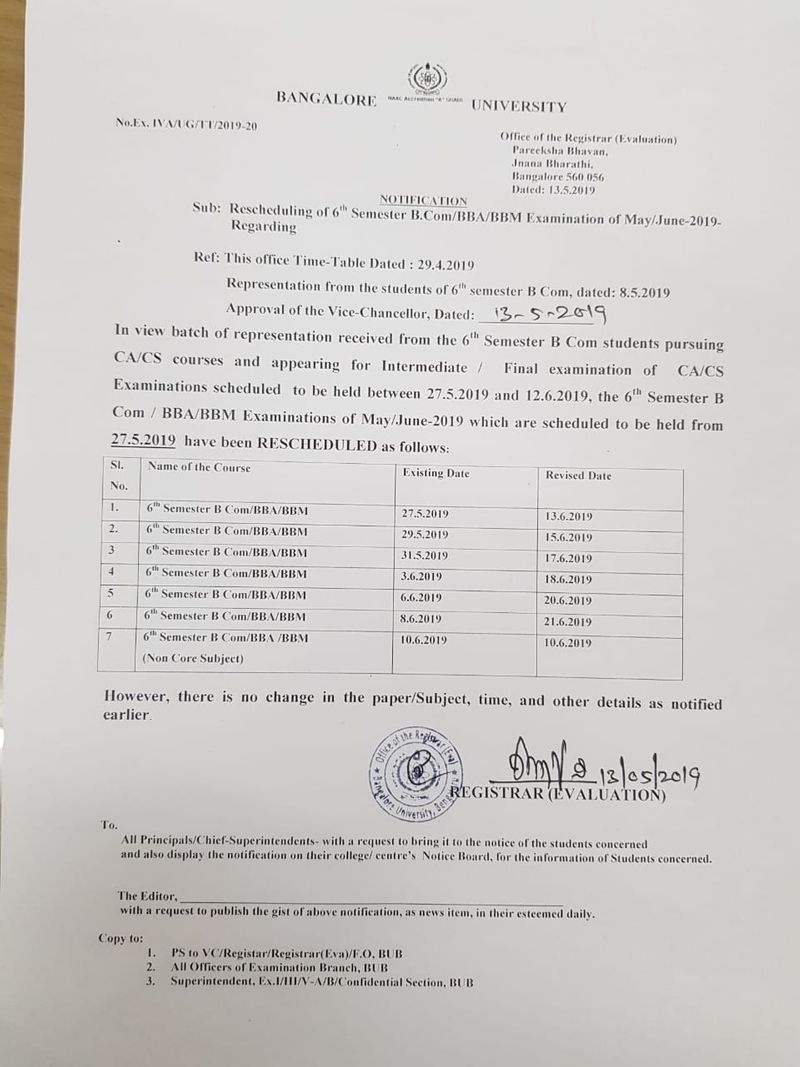 ಇದೇ ಮೇ 27 ರಿಂದ ಜೂನ್ 10 ವರೆಗೆ ಬಿಕಾಂ, ಬಿಬಿಎಂ, ಬಿಸಿಎ 6ನೇ ಸೆಮಿಸ್ಟರ್ ಪರೀಕ್ಷೆಗಳು ನಿಗದಿಯಾಗಿದ್ದವು. ಸದ್ಯ ಬದಲಾದ ವೇಳಾಪಟ್ಟಿ ಪ್ರಕಾರ 10ಜೂನ್ ರಿಂದ 21ನೇ ಜೂನ್ ವರೆಗೆ ಪರೀಕ್ಷೆಗಳು ನಡೆಯಲಿವೆ.