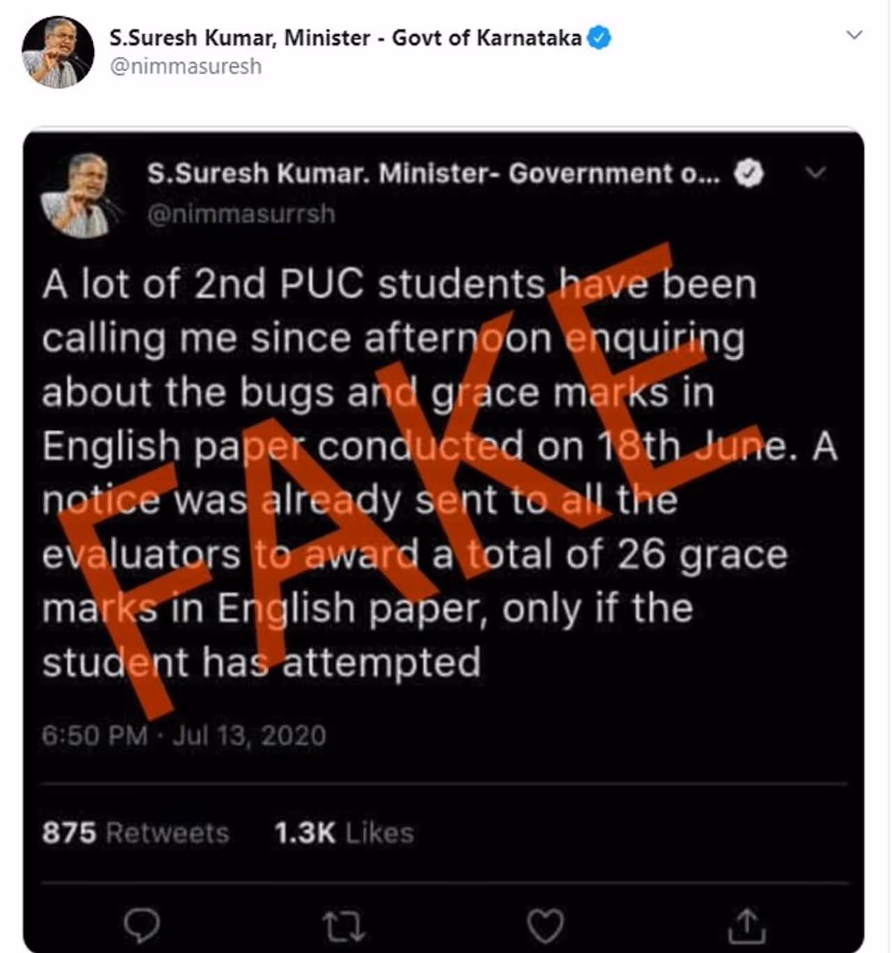 ಮಂಗಳವಾರ ದ್ವಿತೀಯ ಪಿಯುಸಿ ವಾರ್ಷಿಕ ಪರೀಕ್ಷೆಗಳ ಫಲಿತಾಂಶ ಘೋಷಣೆ ಮಾಡುತ್ತಿದ್ದ ಸಂದರ್ಭದಲ್ಲಿ ಸಚಿವರ ಹೆಸರಿನ ನಕಲಿ ಟ್ವಿಟರ್ ಖಾತೆಯಲ್ಲಿ 'ಇಂಗ್ಲಿಷ್ ವಿಷಯದಲ್ಲಿ ವಿದ್ಯಾರ್ಥಿಗಳಿಗೆ 26 ಗ್ರೇಸ್ ಅಂಕಗಳನ್ನು ನೀಡುವ ಕುರಿತು ಮೌಲ್ಯಮಾಪಕರಿಗೆ ಸೂಚಿಸಲಾಗಿದೆ' ಎಂಬ ಸುಳ್ಳು ಸಂದೇಶವನ್ನು ಸಾಮಾಜಿಕ ಜಾಲತಾಣಗಳಲ್ಲಿ ಹರಿಬಿಡಲಾಗಿದೆ ಎಂದು ಪದವಿಪೂರ್ವ ಶಿಕ್ಷಣ ಇಲಾಖೆ ನಿರ್ದೇಶಕರು ಸೈಬರ್ ಕ್ರೈಂ ಪೊಲೀಸರಿಗೆ ನೀಡಿರುವ ದೂರಿನಲ್ಲಿ ತಿಳಿಸಿದ್ದಾರೆ.
