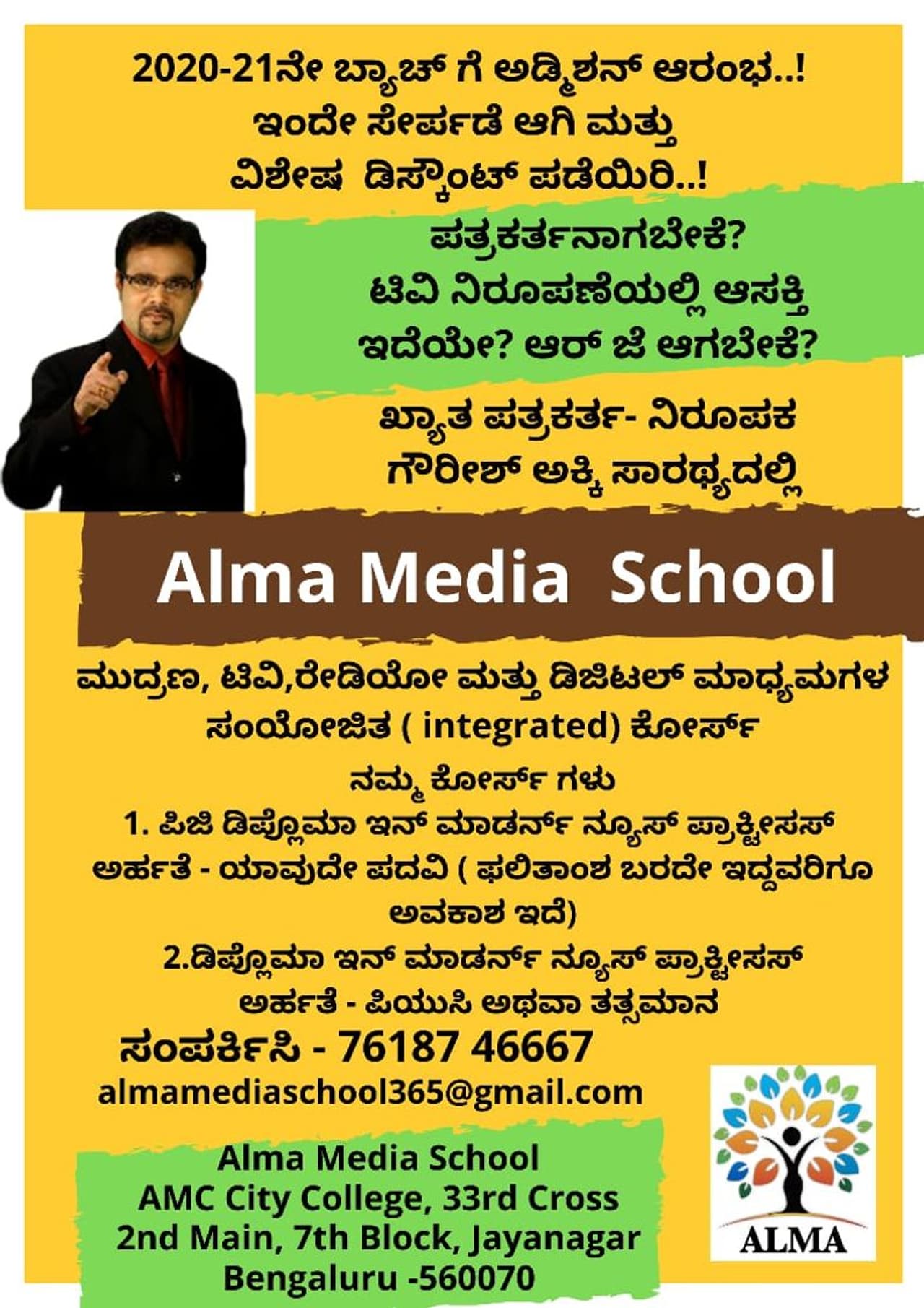 ಬೆಂಗಳೂರು (ಸೆ.16) : ಮಾಧ್ಯಮ ರಂಗದಲ್ಲಿ ಕೆಲಸ ಮಾಡಲಿಚ್ಛಿಸುವವರಿಗೆ ವಿವಿಧ ಕೋರ್ಸ್ಗಳಿಗೆ ತರಬೇತಿ ನೀಡಲು ಪತ್ರಕರ್ತ ಹಾಗೂ ನಿರೂಪಕ ಗೌರೀಶ್ ಅಕ್ಕಿ ಸಾರಥ್ಯದ ‘ಆಲ್ಮಾ ಮೀಡಿಯಾ ಸ್ಕೂಲ್’ ನಲ್ಲಿ ಪ್ರಸಕ್ತ ವರ್ಷದ ಪ್ರವೇಶ ಪ್ರಕ್ರಿಯೆ ಆರಂಭವಾಗಿದೆ.
