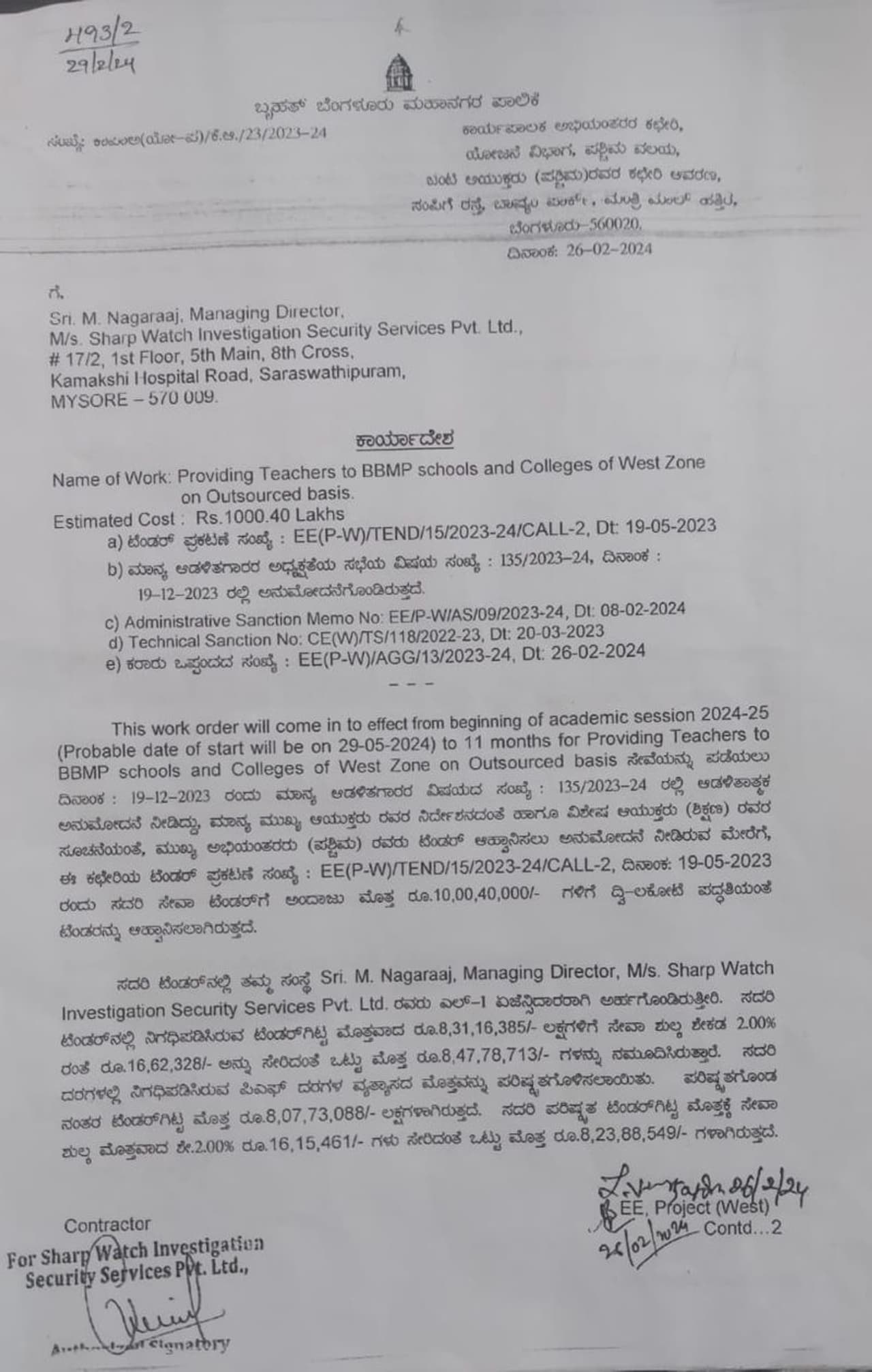 ಬಿಬಿಎಂಪಿ ಶಾಲೆಗಳಿಗೆ ಶಿಕ್ಷಕರ ಸೇವೆ ಪೂರೈಸುತ್ತಿರುವ ಸೆಕ್ಯೂರಿಟಿ ಏನೆಜ್ಸಿಗಳು: