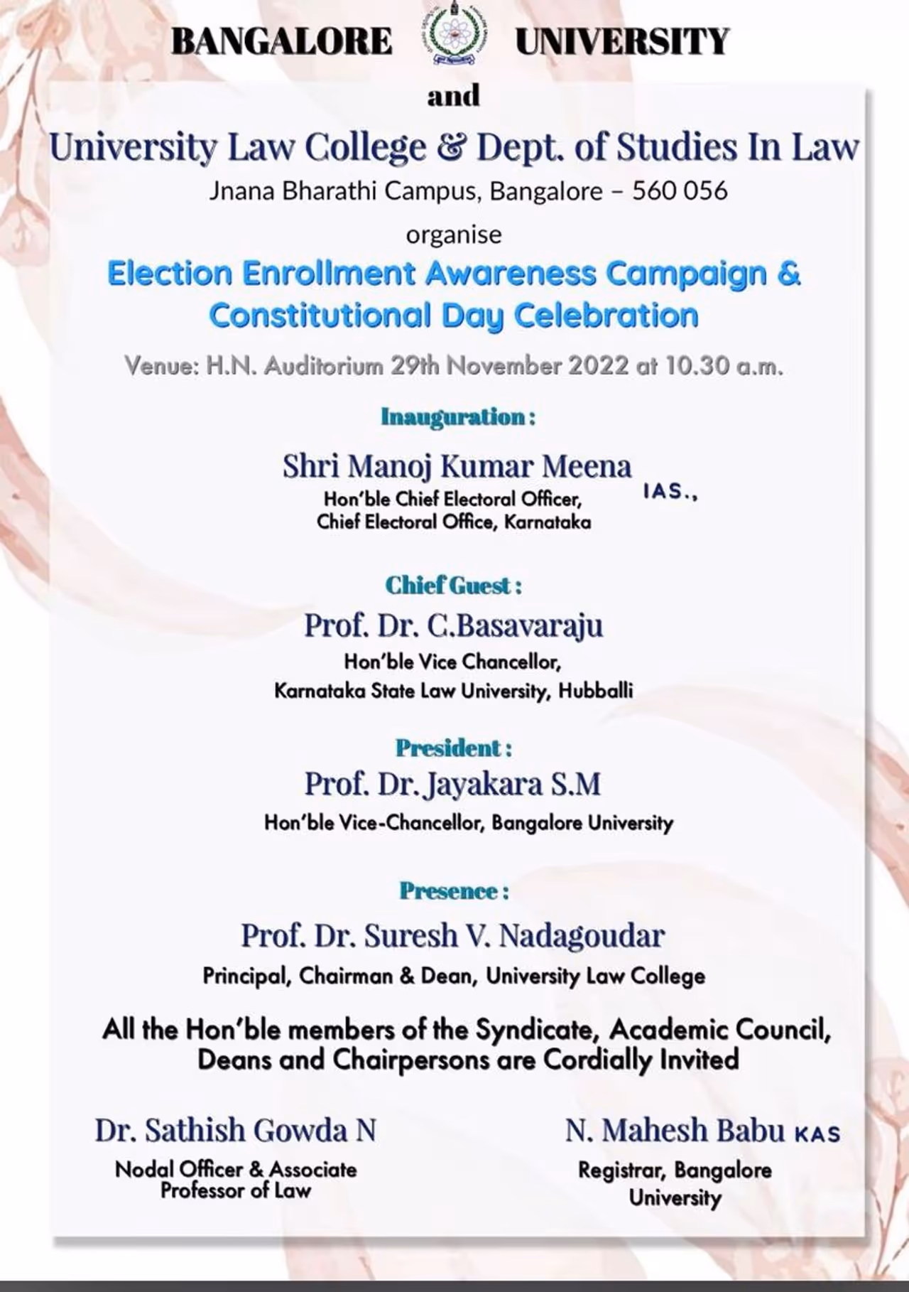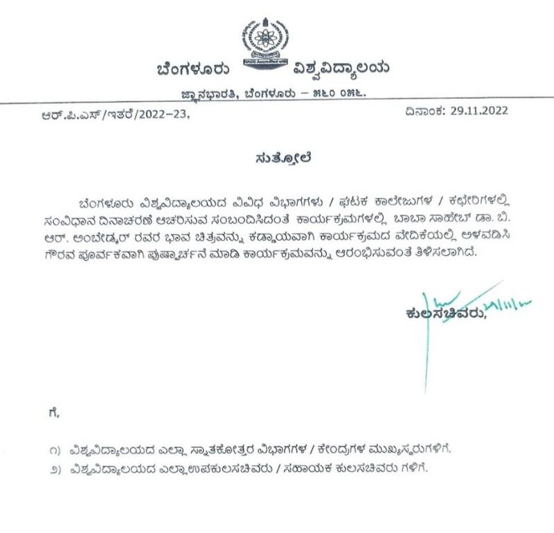 ಯುನಿವರ್ಸಿಟಿ ಲಾ ಕಾಲೇಜ್ ಅಂಡ್ ಡಿಪಾರ್ಟ್ಮೆಂಟ್ ಆಫ್ ಸ್ಟಡೀಸ್ ಇನ್ ಲಾ ಸಂವಿಧಾನ ಶಿಲ್ಪಿ ಅಂಬೇಡ್ಕರ್ ಫೋಟೋ ಇಲ್ಲದೆ ಕಾರ್ಯಕ್ರಮ ಆಯೋಜಿಸಿತ್ತು. ಅಂಬೇಡ್ಕರ್ ಫೋಟೋ ಇಲ್ಲದಕ್ಕೆ ಪಿಎಚ್ಡಿ ವಿದ್ಯಾರ್ಥಿಗಳು ಆಕ್ರೋಶ ವ್ಯಕ್ತಪಡಿಸಿದ ಬಳಿಕ ವಿವಿ ಆಡಳಿತ ಮಂಡಳಿ ಎಚ್ಚೆತ್ತುಕೊಂಡಿತ್ತು.