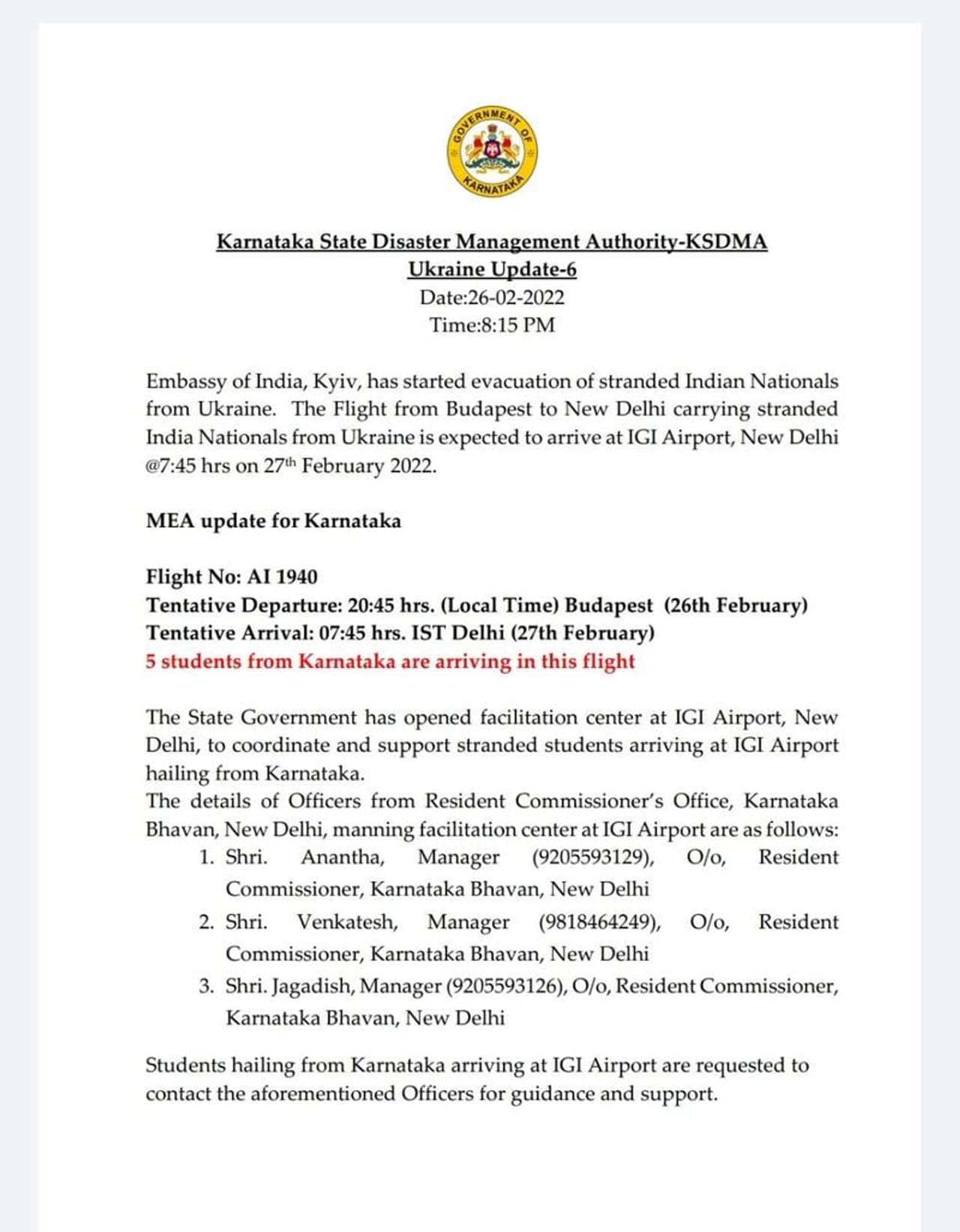 * ಉಕ್ರೇನ್ ನಿಂದ ಭಾನುವಾರ ರಾಜ್ಯದ ಐದು ವಿದ್ಯಾರ್ಥಿಗಳು ಭಾರತಕ್ಕೆ* ದೆಹಲಿ ಬಂದಿಳಿಯಲಿರುವ 5 ವಿದ್ಯಾರ್ಥಿಗಳು.*ದೆಹಲಿಯಲ್ಲಿರುವ ಕರ್ನಾಟಕ ಭವನದ ಅಧಿಕಾರಿಗಳ ಮಾಹಿತಿ
