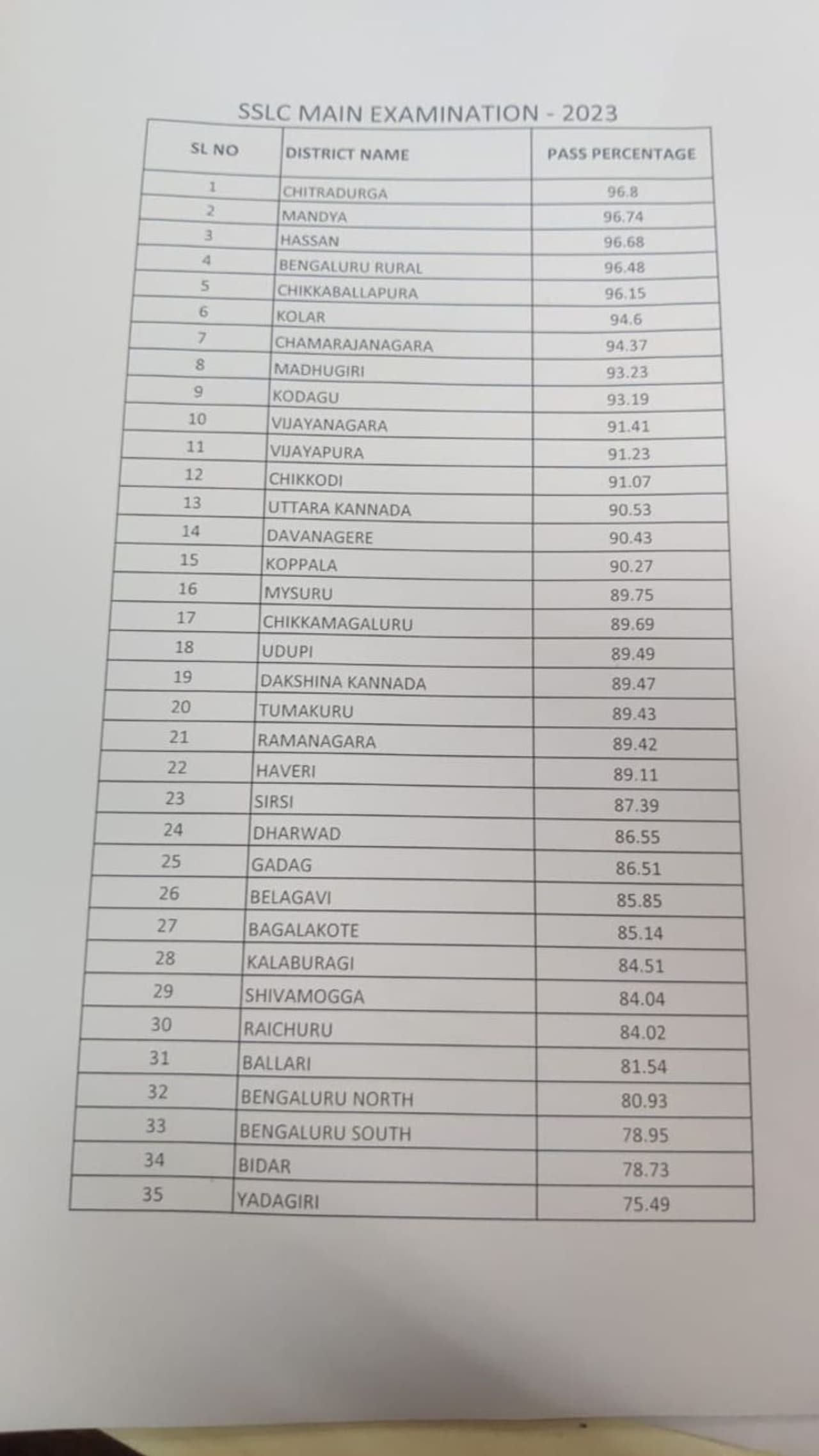 ಮಂಡ್ಯ ಜಿಲ್ಲೆಯು ಶೇಕಡಾ 96.74 ಫಲಿತಾಂಶ ಪಡೆದಿದ್ದು, 2ನೇ ಸ್ಥಾನ ಪಡೆದಿದೆ. ಹಾಸನ 96,.68 ಸ್ಥಾನದೊಂದಿಗೆ 3ನೇ ಸ್ಥಾನ ಪಡೆದಿದೆ. ಉಳಿದಂತೆ ಕೊನೆಯ ಸ್ಥಾನದಲ್ಲಿ ಯಾದಗಿರಿ ಜಿಲ್ಲೆಯಿದ್ದು, ಶೇ.75.49 ಫಲಿತಾಂಶವನ್ನು ಪಡೆದುಕೊಂಡಿದೆ.