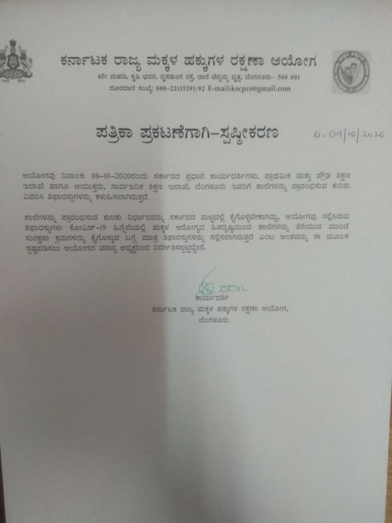 ಕೊರೋನಾ ವೈರಸ್ ನಡುವೆ ಶಾಲಾ-ಕಾಲೇಜು ಆರಂಭಿಸುವ ಕುರಿತು ಪರ ವಿರೋಧಗಳು ಕೇಳಿ ಬರುತ್ತಿದೆ. ಇದರ ನಡುವೆ ಶಾಲೆ ಆರಂಭಿಸುವಂತೆ ಸರ್ಕಾರಕ್ಕೆ ಶಿಫಾರಸು ಮಾಡಿದ್ದು ರಾಜ್ಯ ಮಕ್ಕಳ ಹಕ್ಕುಗಳ ರಕ್ಷಣಾ ಆಯೋಗ ಇದೀಗ ಉಲ್ಟಾ ಹೊಡೆದಿದೆ.