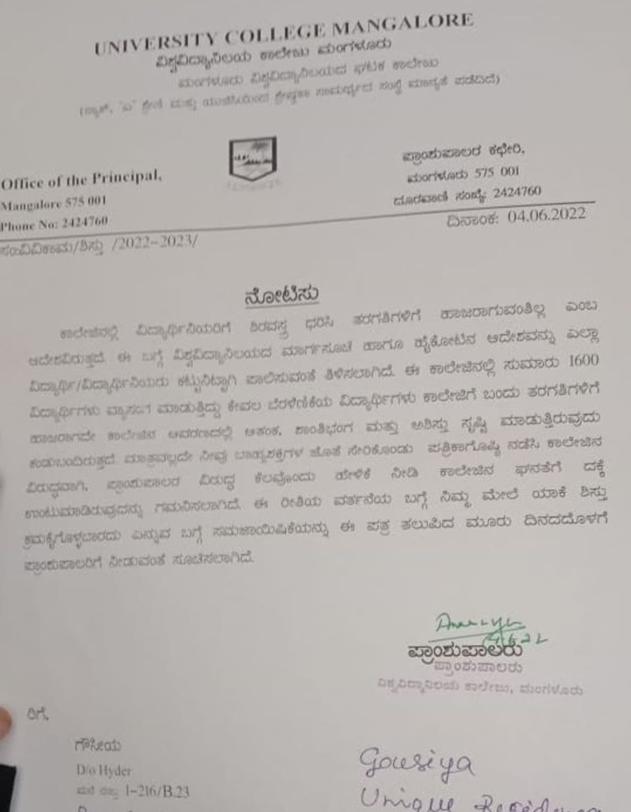 ಮಂಗಳೂರು(ಜೂ.07): ಹಿಜಾಬ್ ವಿವಾದದಲ್ಲಿ ಪಟ್ಟು ಬಿಡದ ಹಿಬಾಬ್ ವಿದ್ಯಾರ್ಥಿಗಳ ವಿರುದ್ಧ ಕೊನೆಗೂ ಮಂಗಳೂರು ವಿವಿ ಕಾಲೇಜು ಆಡಳಿತ ನೋಟಿಸ್ ಅಸ್ತ್ರ ಪ್ರಯೋಗಿಸಿದೆ. ಆದ್ರೆ ಈ ನೋಟಿಸ್ನಲ್ಲಿ ಉಲ್ಲೇಖಿಸಲಾದ 'ಬಾಹ್ಯ ಶಕ್ತಿಗಳು' ಅನ್ನೋ ವಿಚಾರವೊಂದು ಪರೋಕ್ಷವಾಗಿ ಕ್ಯಾಂಪಸ್ ಫ್ರಂಟ್ ಆಫ್ ಇಂಡಿಯಾದತ್ತ ಬೆರಳು ನೆಟ್ಟಿದೆ.