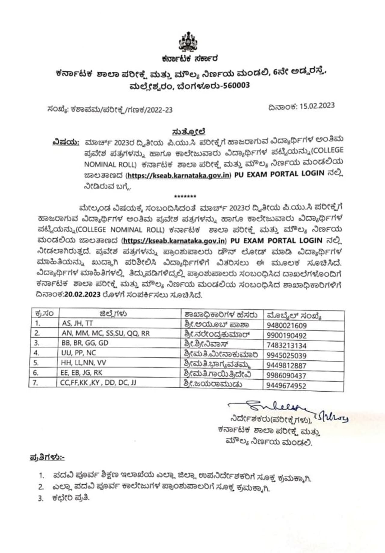 ಈ ಬಗ್ಗೆ ಪತ್ರಿಕಾ ಪ್ರಕಟಣೆ ಮೂಲಕ ಯಲ್ಲಿ ಮಾಹಿತಿ ನೀಡಿರುವ ಕರ್ನಾಟಕ ಶಾಲಾ ಪರೀಕ್ಷೆ ಮತ್ತು ಮೌಲ್ಯ ನಿರ್ಣಯ ಮಂಡಳಿಯ ನಿರ್ದೇಶಕರು, ಮಾರ್ಚ್ 2023ರಲ್ಲಿ ನಡೆಯಲಿರುವ ದ್ವಿತೀಯ ಪಿಯುಸಿ ವಾರ್ಷಿಕ ಪರೀಕ್ಷೆಗೆ ಹಾಜರಾಗುವ ವಿದ್ಯಾರ್ಥಿಗಳ ಅಂತಿಮ ಪ್ರವೇಶ ಪತ್ರಗಳನ್ನು ಮಂಡಳಿಯ ಜಾಲತಾಣ https://kseab.karnataka.gov.in ನಲ್ಲಿ ಬಿಡುಗಡೆ ಮಾಡಲಾಗಿದೆ. ಆಯಾ ಕಾಲೇಜುಗಳ ಮುಖ್ಯಸ್ಥರು, ಆಡಳಿತ ವಿಭಾಗ ಮತ್ತು ಪ್ರಾಂಶುಪಾಲರು ಪಿಯು ಪರೀಕ್ಷೆ ಪೋರ್ಟಲ್ ಲಾಗಿನ್ ಆಗಿ ಪ್ರವೇಶ ಪತ್ರಗಳನ್ನು ವಿದ್ಯಾರ್ಥಿಗಳಿಗೆ ಹಂಚಿಕೆ ಮಾಡಲು ಸೂಚಿಸಲಾಗಿದೆ.