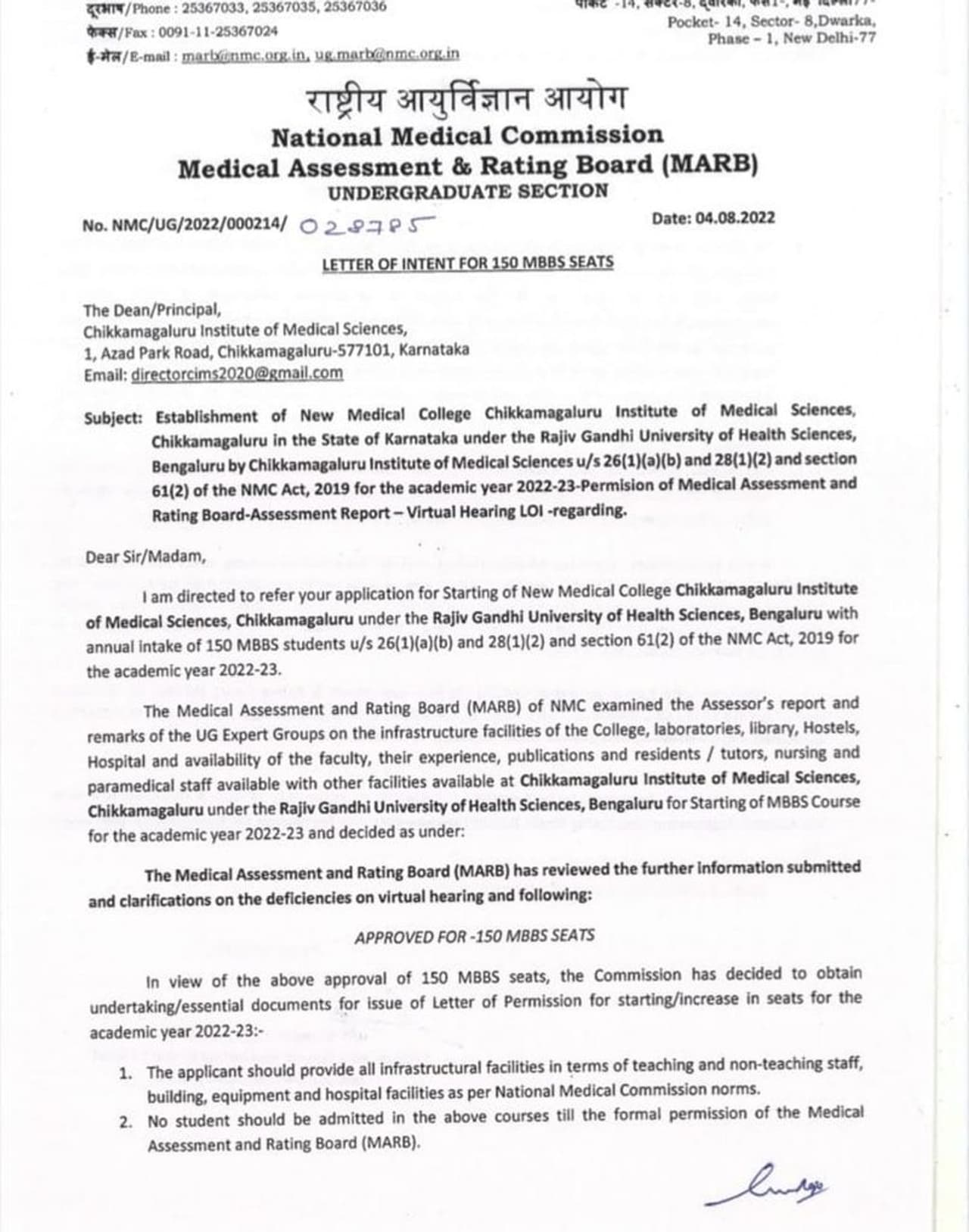 ಬೆಂಗಳೂರು/ಚಿಕ್ಕಮಗಳೂರು(ಆ.05): ಚಿಕ್ಕಮಗಳೂರಿನ ನೂತನ ಸರ್ಕಾರಿ ವೈದ್ಯಕೀಯ ಕಾಲೇಜಿಗೆ ಮುಂದಿನ ಶೈಕ್ಷಣಿಕ ವರ್ಷದಿಂದ 150 ಎಂಬಿಬಿಎಸ್ ಸೀಟ್ಗಳೊಂದಿಗೆ ಪ್ರವೇಶಾತಿ ಆರಂಭಿಸಲು ರಾಷ್ಟ್ರೀಯ ವೈದ್ಯಕೀಯ ಪರಿಷತ್ ಅನುಮತಿ ನೀಡಿದೆ. ರಾಜೀವ್ ಗಾಂಧಿ ಆರೋಗ್ಯ ವಿಜ್ಞಾನಗಳ ವಿಶ್ವವಿದ್ಯಾಲಯದ ವ್ಯಾಪ್ತಿಯಲ್ಲಿ ನೂತನವಾಗಿ ಸ್ಥಾಪಿಸಲಾಗಿರುವ ಚಿಕ್ಕಮಗಳೂರು ವೈದ್ಯಕೀಯ ವಿಜ್ಞಾನ ಸಂಸ್ಥೆಯ ಮೂಲಭೂತ ಸೌಕರ್ಯ, ಪ್ರಯೋಗಾಲಯ, ಗ್ರಂಥಾಲಯ, ವಸತಿ ನಿಲಯ, ಆಸ್ಪತ್ರೆ, ಅಧ್ಯಾಪಕರ ಲಭ್ಯತೆ ಮತ್ತು ಅವರ ಅನುಭವ, ಜರ್ನಲ್ಗಳಲ್ಲಿನ ಸಂಶೋಧನಾ ವರದಿ ಪ್ರಕಟಣೆ, ನರ್ಸಿಂಗ್ ಮತ್ತು ಪ್ಯಾರಾ ಮೆಡಿಕಲ್ ಸಿಬ್ಬಂದಿಯ ಲಭ್ಯತೆ ಮುಂತಾದವುಗಳನ್ನು ಪರಿಶೀಲಿಸಿ ಈ ಅನುಮತಿ ನೀಡಲಾಗಿದೆ ಎಂದು ವೈದ್ಯಕೀಯ ಪರಿಷತ್ ತಿಳಿಸಿದೆ.