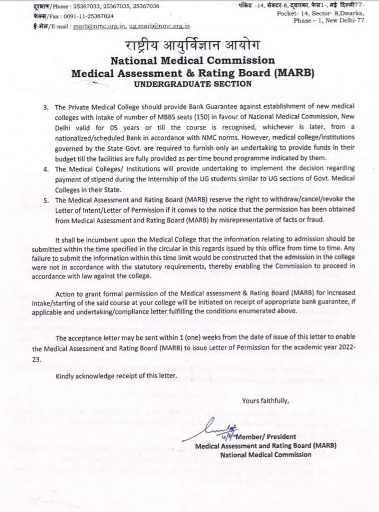 ರಾಷ್ಟ್ರೀಯ ವೈದ್ಯಕೀಯ ಪರಿಷತ್ ಮಾರ್ಗಸೂಚಿಯ ಪ್ರಕಾರ, ಅಗತ್ಯವಾದ ಎಲ್ಲ ಸೌಕರ್ಯ, ಸಿಬ್ಬಂದಿಯನ್ನು ಸಂಸ್ಥೆ ಹೊಂದಿರಬೇಕು. ವೈದ್ಯಕೀಯ ಮೌಲ್ಯಮಾಪನ ಮತ್ತು ರೇಟಿಂಗ್ ಮಂಡಳಿಯ ಅಧಿಕೃತ ಅನುಮತಿ ಸಿಗುವ ತನಕ ವಿದ್ಯಾರ್ಥಿಗಳನ್ನು ದಾಖಲಿಸಿಕೊಳ್ಳಬಾರದು ಮುಂತಾದ ಷರತ್ತುಗಳನ್ನು ವಿಧಿಸಲಾಗಿದೆ.