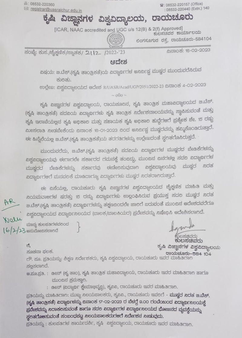 ಕೃಷಿ ವಿವಿಯ ಆವರಣದಲ್ಲಿನ ವಸತಿ ನಿಲಯದಲ್ಲಿ ಪ್ರವೇಶ ನಿಷೇಧಿಸಿ ಆದೇಶ ಹೊರಡಿಸಿದ ರಾಯಚೂರು ಕೃಷಿ ವಿವಿಯ ಕುಲಸಚಿವರು