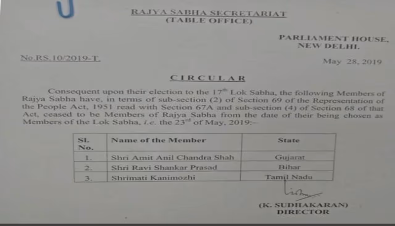 ಈ ಕುರಿತು ಅಧಿಕೃತ ಆದೇಶ ಹೊರಡಿಸಿರುವ ರಾಜ್ಯಸಭಾ ಕಾರ್ಯದರ್ಶಿ, ಲೋಕಸಭೆಗೆ ಆಯ್ಕೆಯಾದ ಸದಸ್ಯರು ತಮ್ಮ ರಾಜ್ಯಸಭಾ ಸದಸ್ಯತ್ವಕ್ಕೆ ರಾಜೀನಾಮೆ ನೀಡಿದ್ದಾರೆ ಎಂದು ತಿಳಿಸಿದ್ದಾರೆ.