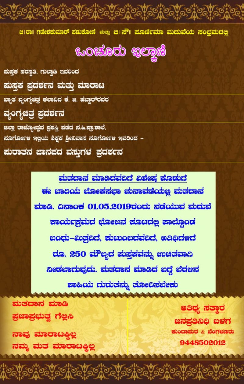 ಆದರೆ ಇಲ್ಲೋಂದು ವಿಶೇಷ ವಿವಾಹ ಆಮಂತ್ರಣ ಪತ್ರಿಕೆ ಇದೆ, ಅದರಲ್ಲಿ ಮತದಾನ ಮಾಡಿ, ಪ್ರಜಾಪ್ರಭುತ್ವ ಗೆಲ್ಲಿಸಿ, ನಾವು ಮಾರಾಟಕ್ಕಿಲ್ಲ, ನಮ್ಮ ಮತ ಮಾರಾಟಕ್ಕಿಲ್ಲ ಎಂಬ ಸಂದೇಶವನ್ನೂ ಮುದ್ರಿಸಲಾಗಿದೆ, ಈ ಮೂಲಕ ಈ ಸಕಾಲಿಕ ಸಂದೇಶ ವಧುವರರ ಎಲ್ಲಾ ಬಂಧು ಬಳಗವನ್ನು ತಲುಪುತ್ತಿದೆ. ಮೇ 1ರಂದು ಕುಂದಾಪುರ ತಾಲೂಕಿನ ತಲ್ಲೂರು ಗ್ರಾಮದ ಪಾರ್ತಿಕಟ್ಟೆ ಶ್ರೀಶೇಷಕೃಷ್ಣ ಸಭಾಭವನದಲ್ಲಿ ನಡೆಯುವ ಗೌರಿ ಶ್ರೀನಿವಾಸ್ ಇವರ ಪುತ್ರ ಗಣೇಶ್ ಕುಮಾರ್ ಪಡುಕೋಣೆ ಮತ್ತು ಲೀಲಾವತಿ ನಾರಾಯಣ ಅವರ ಪುತ್ರಿ ಪೂರ್ಣಿಮಾ ಅವರ ವಿವಾಹ ಆಮಂತ್ರಣ ಪತ್ರಿಕೆ ಇದು.