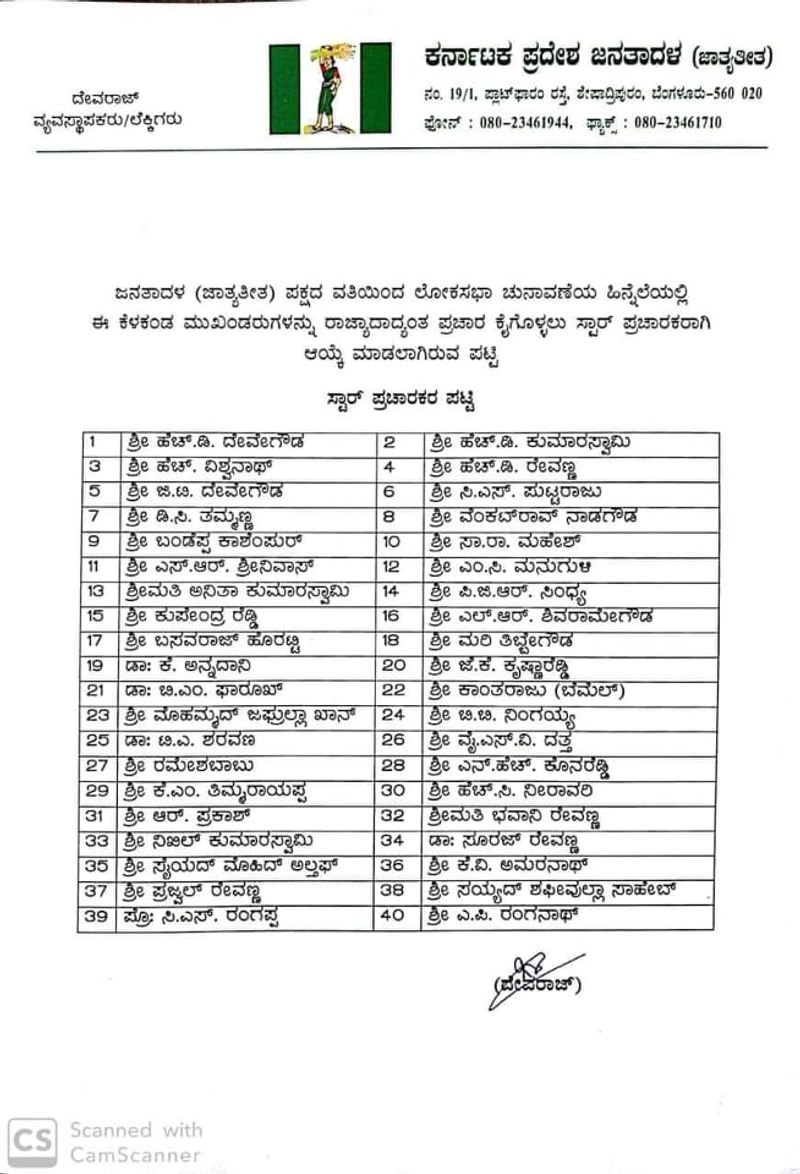 ಸ್ಟಾರ್ ಪ್ರಚಾರಕರ ಪಟ್ಟಿಯಲ್ಲಿ ಮಾಜಿ ಪ್ರಧಾನಿ ಹೆಚ್.ಡಿ ದೇವೇಗೌಡ, ಸಿಎಂ ಕುಮಾರಸ್ವಾಮಿ, ಜೆಡಿಎಸ್ ರಾಜ್ಯಾಧ್ಯಕ್ಷ ಹೆಚ್. ವಿಶ್ವನಾಥ್, ಹೆಚ್.ಡಿ ರೇವಣ್ಣ, ಅನಿತಾ ಕುಮಾರಸ್ವಾಮಿ, ಭವಾನಿ ರೇವಣ್ಣ, ಸೂರಜ್ ರೇವಣ್ಣ ಸೇರಿದಂತೆ ಚುನಾವಣಾ ಕಣದಲ್ಲಿ ಸ್ಪರ್ಧೆಗಿಳಿದಿರುವ ನಿಖಿಲ್, ಪ್ರಜ್ವಲ್ ಕೂಡ ಸ್ಟಾರ್ ಪ್ರಚಾರಕರಾಗಿದ್ದಾರೆ.