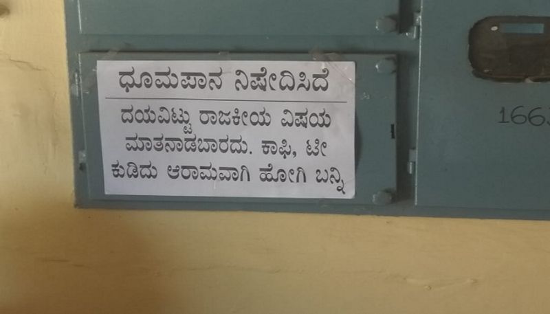 ಆದರೆ ಮಂಡ್ಯದ ವಾದಿರಾಜ್ ಕಾಫಿ ಶಾಪ್ ಮಾಲೀಕ ಮಾತ್ರ ಇದಕ್ಕೆ ಅಪವಾದ. ತಮ್ಮ ಕ್ಯಾಂಟೀನ್ನಲ್ಲಿ ಧೂಮಪಾನ ನಿಷೇಧಿಸಿದೆ ಎಂಬ ಒಕ್ಕಣಿಕೆ ಕೆಳಗೆ ರಾಜಕೀಯ ಚರ್ಚೆ ನಿಷೇಧಿಸಿದೆ ಎಂದು ಬರೆದಿದ್ದಾರೆ ವಾದಿರಾಜ್.