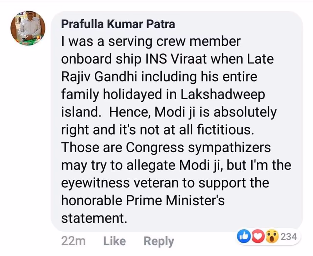 ಇದರ ಬೆನ್ನಲ್ಲೇ INS ವಿರಾಟ್ ಯುದ್ಧನೌಕೆಯಲ್ಲಿ ಸೇವೆ ಸಲ್ಲಿಸಿದ್ದ ಪ್ರಫುಲ್ಲ ಕುಮರ್ ಪತ್ರಾರ ಫೇಸ್ಬುಕ್ ಕಮೆಂಟ್ ಒಂದು ಭಾರೀ ವೈರಲ್ ಆಗುತ್ತಿದೆ. ಪ್ರಧಾನಿ ಮೋದಿ ಹೇಳಿಕೆಯನ್ನು ಸಮರ್ಥಿಸಿಕೊಂಡಿರುವ ಪಾತ್ರಾರವರು ದಿವಂಗತ ಪ್ರಧಾನಿ ರಾಜೀವ್ ಗಾಂಧಿ ತಮ್ಮ ಕುಟುಂಬ ಸಮೇತ ಲಕ್ಷದ್ವೀಪಕ್ಕೆ ರಜೆ ದಿನಗಳನ್ನು ಕಳೆಯಲು INS ವಿರಾಟ್ ನಲ್ಲಿ ತೆರಳಿದ್ದಾಗ ನಾನೂ ಆ ಯುದ್ಧನೌಕೆಯಲ್ಲಿ ಸೇವೆಯಲ್ಲಿದ್ದೆ, ಇದಕ್ಕೆ ನಾನೇ ಸಾಕ್ಷಿ ಎಂದಿದ್ದಾರೆ.